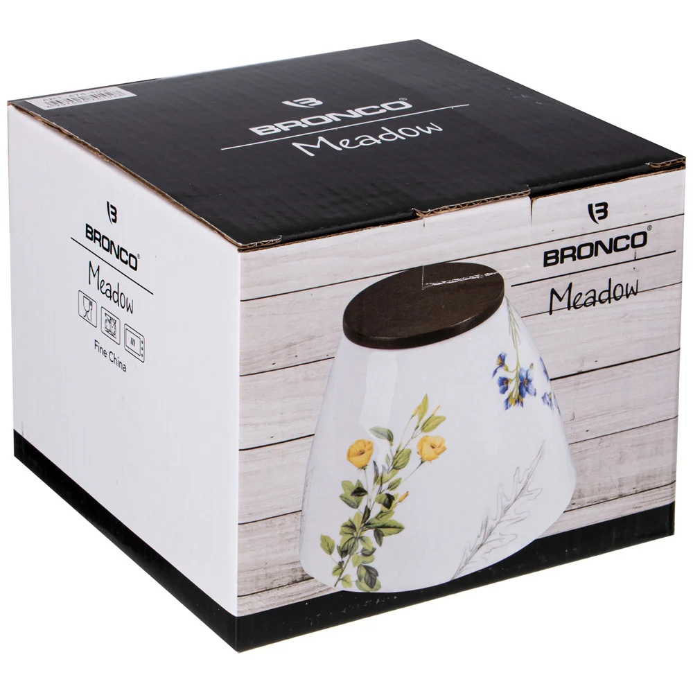 ТМ BRONCO модная коллекция "MEADOW" с ботаническим рисунком. Новый имидж посуды на каждый день! Ручная работа. Упрочненный фарфор. Посуда прошла сертификацию. Безопасна для контакта с пищевыми продуктами. Современные формы и удобные размеры. Отлично сочетается с натуральными зеленым, мятным и кремовым цветами. Неповторимая сервировка. Можно пользовать в микроволновой печи, ставить в холодильник и мыть в посудомоечной машине. Деревянную крышку нельзя ставить в микроволновую печь, не рекомендуется мыть в посудомоечной машине.