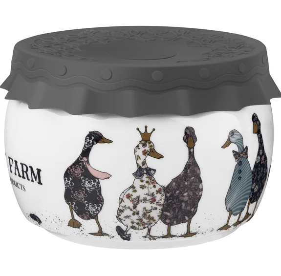 - Материал. Фарфор обеспечивает долговечность и лёгкость в уходе, а силиконовая крышка плотно закрывает ёмкость, сохраняя свежесть содержимого.