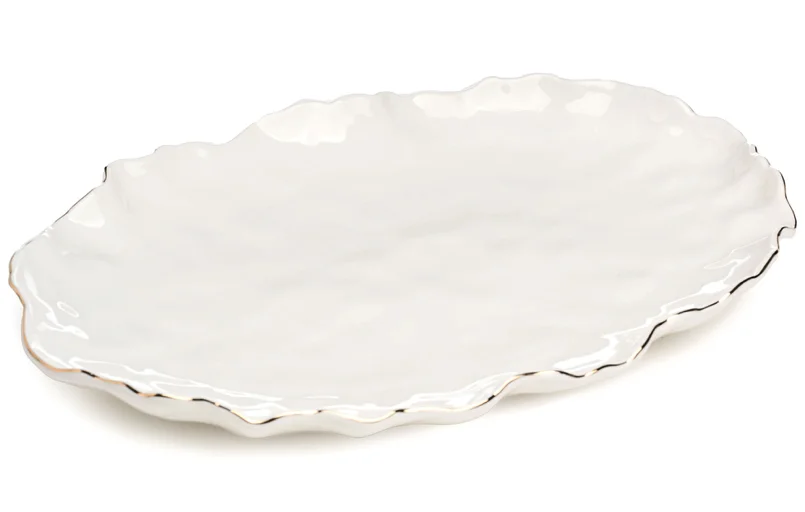 - Дизайн. Белоснежный «мятый» фарфор с волнистым краем и тонкой золотой окантовкой, нанесённой вручную. Глянцевая глазурь придаёт поверхности блеск.