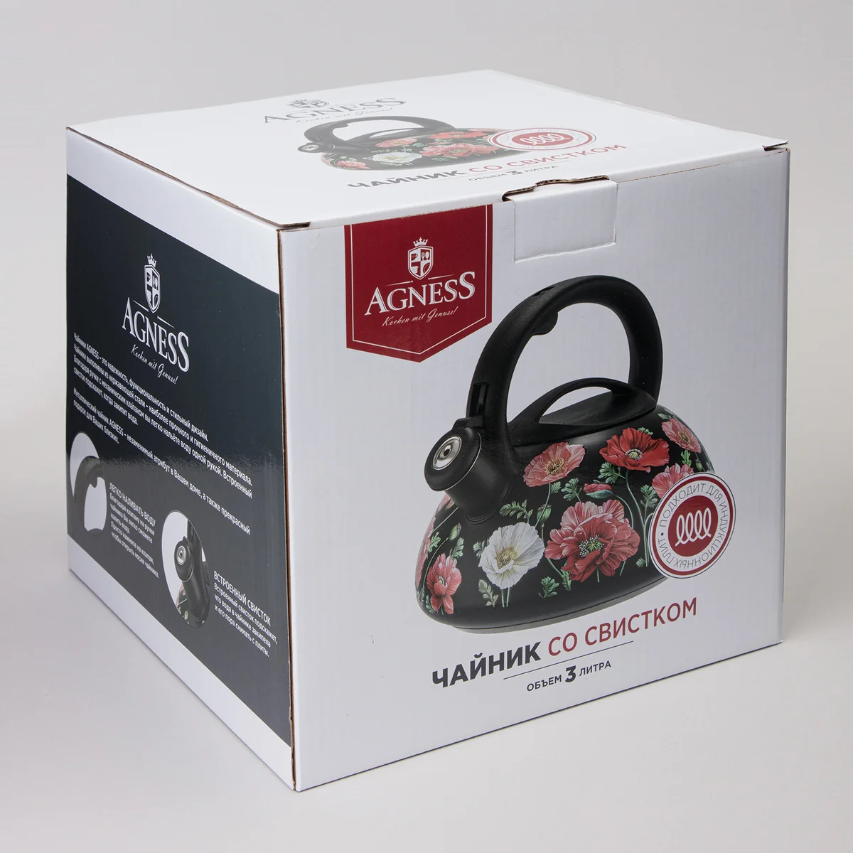Чайник AGNESS - это надежность, функциональность и стильный дизайн. Чайник выполнен из нержавеющей стали - наиболее прочного и гигиеничного материала. Преимущества: • Удобная ненагревающаяся ручка • Легко наливать воду. Используя клапан на ручке чайника, вы легко сможете налить воду. Просто нажмите на клапан, чтобы открыть носик чайника. • Встроенный свисток подскажет, что вода в чайнике закипела и его пора снимать с плиты. • Благодаря внешнее жаропрочному покрытию и стильному дизайну чайник AGNESS украсит любую кухню • Подходит для всех типов плит, включая Индукционные Металлический чайник AGNESS - незаменимый атрибут в Вашем доме, а также прекрасный подарок для Ваших близких. Внимание! Не нагревайте пустой чайник. Рекомендуется нагревать чайник, наполнив его на 2/3 от общего объема. Следите, чтобы диаметр конфорки совпадал или был меньше диаметра дна чайника. Пламя от газовой конфорки не должно попадать на корпус чайника. Не подходит для использования в микроволновой печи и посудомоечной машине. Рекомендована ручная мойка.