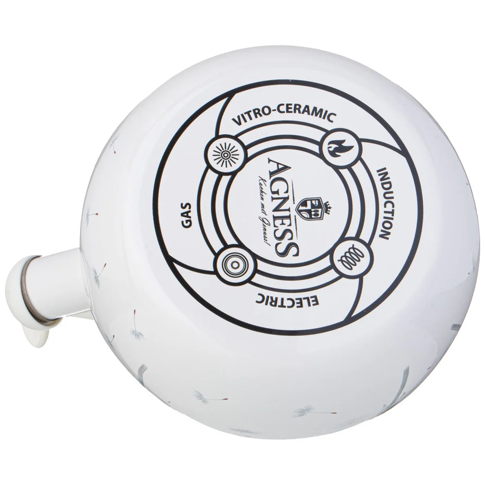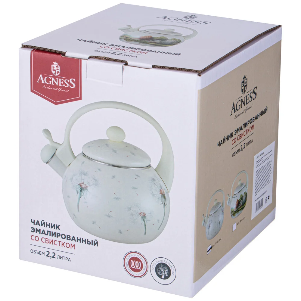 Эмалированная посуда AGNESS - отличный выбор для Вашей кухни! Посуда из эксклюзивной серии «Dandelion» от торговой марки AGNESS станет приятным акцентом на любой кухне. Благодаря неповторимому дизайну каждое изделие будет настоящим украшением вашей кухни. Данная посуда прекрасно подойдет в качестве подарка и никого не оставит равнодушным. Сделайте себе подарок, побалуйте себя и своих близких! Эмалированная посуда обладает рядом преимуществ: • Эмалированная посуда не требует особого ухода и легко моется • Эмалированная посуда гигиенична - не удерживает болезнетворных микробов и бактерий • Удобная ненагревающаяся ручка • Легко наливать воду. Используя клапан на свитске чайника, вы легко сможете налить воду. Просто нажмите на клапан, чтобы открыть носик чайника. • Эмалированная посуда подходит для всех видов плит, включая ИНДУКЦИОННЫЕ ПЛИТЫ. • Посуда проходит 3 этапа обжига, эта технология позволяет сохранить яркость расцветок деколи, а также придает прочность эмалированной посуде • Все деколи наносятся вручную, а затем обжигаются при температуре около 800 С • Толщина стенок и дна посуды 0,8мм Правила ухода за эмалированной посудой просты: • Не использовать абразивные чистящие средства; • Мыть с применением нейтральных моющих средств, подходит для мытья в посудомоечной машине; • Избегать резкого перепада температур. • Не нагревать пустой чайник, а также не допускать выкипания воды • При транспортировке, хранение и спользовании необходимо оберегать эмалированную посуду от механических повреждений