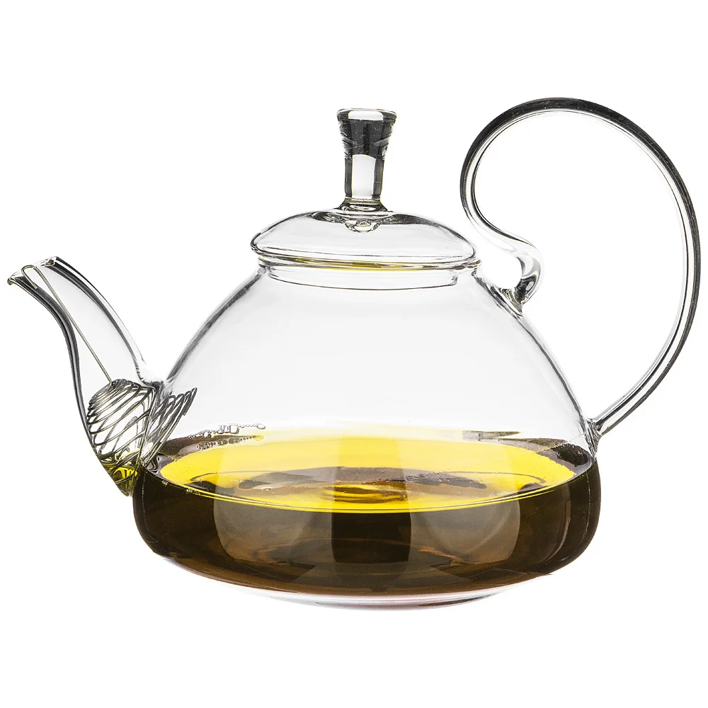 Заварочный стеклянный чайник выполнен в элегантной форме с изысканной ручкой. Фильтр из высококачественной нержавеющей стали закреплен в носике чайника и прекрасно задерживает заварку. Сквозь прозрачные стенки чайника можно любоваться процессом заваривания и красотой напитка.
