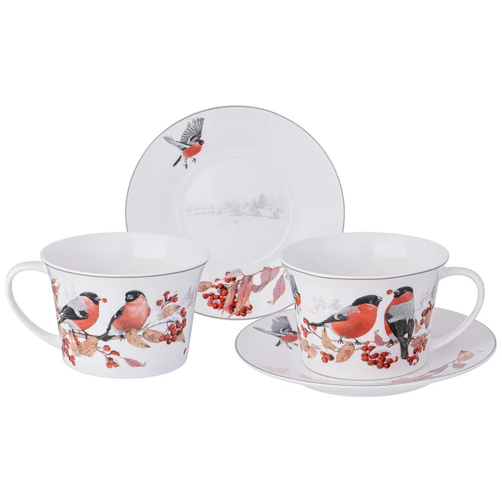 Зимой на фоне белого снега снегири на ветках выглядят наиболее эффектно и нарядно, словно праздничные шарики украсили деревья. Зимний снегирь - это своего рода символ снега, мороза, заснеженных деревьев, хорошего настроения и праздников. Снегири очень любят рябину. Обычно они подлетают к дереву стайкой и снегири, как настоящие джентльмены и знатоки хороших манер, предоставляют право своим дамам выбрать самые сочные и вкусные грозди ягод. Фото снегирей очень часто украшают различные новогодние открытки, календари, журналы. Дизайнеры ТМ LEFARD разместили этих ярких птиц на белоснежном тонкостенном фарфоре. Коллекция «Снегири» хороша для ежедневного использования и создания праздничного настроения. Яркая и стильная упаковка. Хороший подарок. Продукция сертифицирована, безопасна для контакта с пищевыми продуктами. Можно смело использовать в посудомоечной машине и микроволновой печи.