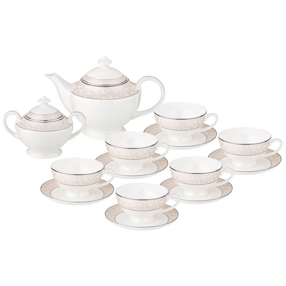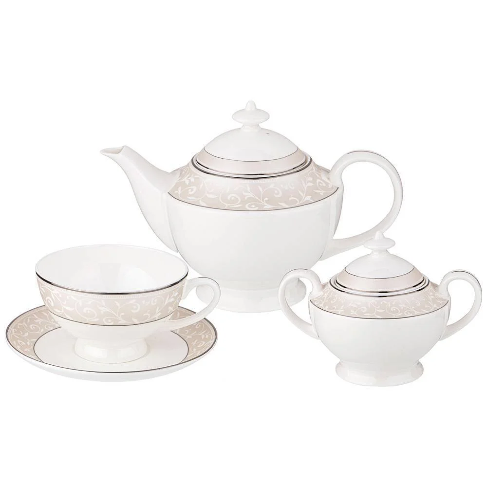 ТМ LEFARD коллекции столовой посуды из костяного фарфора. "5 o'clock" не оставит равнодушным и украсит любой праздничный стол. Ваш стол стильный, элегантный, с изящным орнаментом и тонкой золотой полосой по краю. 45 % костяной золы сделало изделия тонкими, прочными, прозрачными, мягкого молочного цвета. Изготовление изделий из костяного фарфора не поддаётся автоматизации, производство таких вещей возможно только с использованием ручного труда. Не рекомендуется использовать в микроволной печи, посудомоечной машине. Комплектность: чайник 1200 мл, сахарница 300 мл, чашка 250 мл 6 шт., блюдце 6 шт.