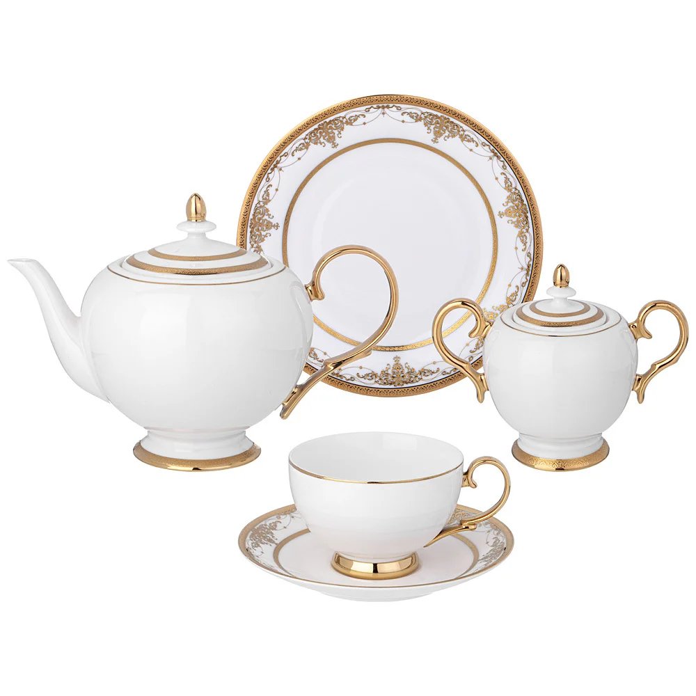 ТМ LEFARD Сервиз чайный "Дворец" для торжественного чаепития и семейных застолий. Изысканный фарфор Bone Pocelain с эффектом костяного фафора, тонкий и полупрозрачный, прочный и никогда не темнеет. Утонченный кружевной рельефный орнамент выглядит объемным и привлекательным благодаря различной обработке выпуклых и базовых поверхностей. Изящная золотая обводка придает блеск и торжественность. Эта посуда замечательный подарок на свадьбу, юбилей, день рождения, который наверняка пригодится каждой семье, запомнится навсегда и прослужит долгие годы. Дизайнеры торговой марки предлагают обеденный сервиз и наборы тарелок и чайных пар, чтобы сформировать полную сервировку стола предметами коллекции на 6 или 12 персон. Не рекомендуется мыть в посудомоечной машине. Нельзя использовать в микроволновой печи.