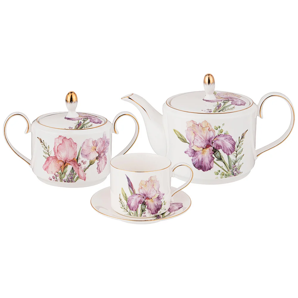 TM Lefard коллекция "Ирис" - это эксклюзивная коллекция нежных ирисов на модных формах с золотой окантовкой. Первый цветок ириса появился где-то в юго-восточной Азии в древние времена. Ирис был так красив, что им любовались и звери, и птицы, и воды, и ветры. Они разнесли семена этого необычного цветка по всему миру. И теперь благодаря им мы любуемся разнообразием этих красивых цветов. Качественный тонкостенный фарфор, "живые" натуральные цвета декора, красочная упаковка делают предметы коллекции прекрасным подарком к любому случаю. Продукция сертифицирована. Безопасна для контакта с пищевыми продуктами. Нельзя ставить в микроволновую печь, не рекомендуется мыть в посудомоечной машине. Комплектность: Чайник 1000мл – 1 шт.; сахарница 350мл – 1 шт.; чашка 260мл – 6 шт.; блюдце – 6шт.
