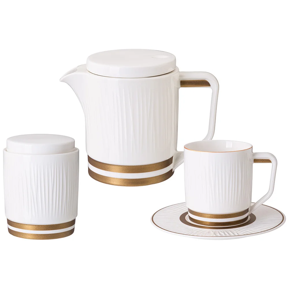 Коллекция «Herbal” ТМ LEFARD – это настоящая находка для хозяйки. Удивить гостей и домашних совсем непросто и поэтому дизайнеры торговой марки обращают внимание на способы подачи блюд и организацию чаепитий. Мармиты прямоугольные и овальные, менажницы круглые и прямоугольные на 4 и 5 секций с пластиковыми крышками и без, креманки, салатники разных размеров, банки, чайники с металлическими ситами, чайные пары и кружки помогут в этом. Изделия выполнены из упрочненного фарфора с отделкой близкой по цвету золотой. Красивый рельеф напоминает стебли сочных трав и создает игру света благодаря блестящей глянцевой поверхности. Это хороший подарок. Стильная цветная упаковка. Посуда прошла сертификацию. Безопасна для контакта с пищевыми продуктами. Изделия не рекомендуется использовать в микроволновой печи, мыть в посудомоечной машине. Комплектность: чайник 1000 мл - 1 шт., сахарница 320 мл - 1 шт, чашка 250 мл - 6 шт., блюдце - 6 шт.