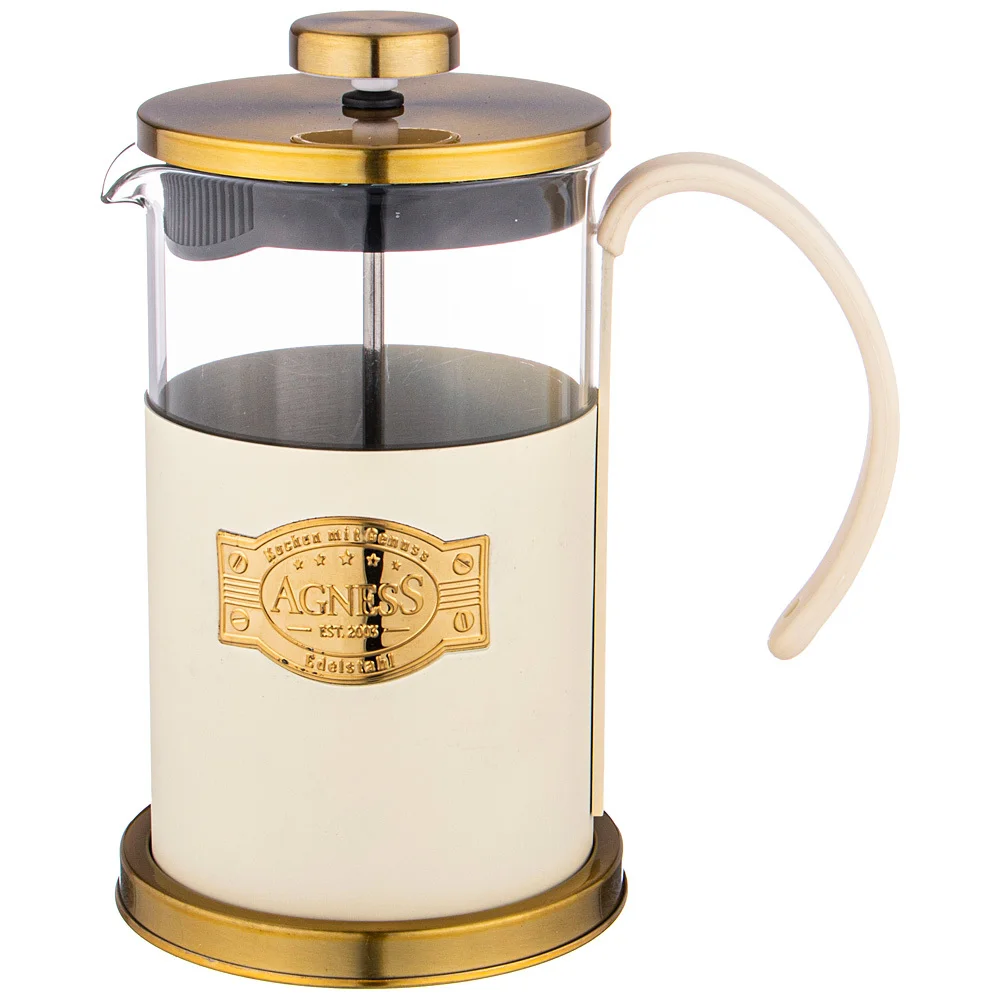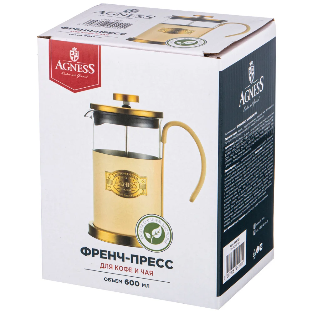 Френч-прессы TM AGNESS пользуются большой популярностью среди покупателей. И это неудивительно, так как продукция отличается не только стильным инновационным коллекционным дизайном, но и простотой в использовании, которая дарит удовольствие от приготовления насыщенного кофе или ароматного чая и обеспечивает превосходное качество напитка, полностью раскрывает аромат и вкус. Френч-пресс идеален в любой обстановке: дома, в кафе или в офисе. Инструкция по применению Во время использования поставьте френч-пресс на сухую, ровную и нескользящую поверхность. Крепко удерживая френч-пресс за ручку, вытяните пресс-фильтр ровно вверх. Засыпьте чай, травы или кофе грубого помола (кофе мелкого помола может забить фильтр и привести к высокому давлению). Наполните горячей водой 96°С (не кипятком), оставляя 3 см до края. Перемешайте. Дайте напитку настояться 4 мин. Затем крепко удерживая френч-пресс за ручку, опустите пресс вниз без применения силы. Если пресс не опускается вниз под легким давлением, вытащите стержень из френч-пресса, перемешайте и после этого медленно опустите фильтр. Чрезмерное давление может привести к повреждению корпуса. Будьте осторожны! Перед каждым использованием убедитесь, что на корпусе нет механических повреждений, трещин и сколов. Изделие нельзя использовать, если имеются механические повреждения корпуса, сколы и трещины. Не мыть в ПММ. При длительном нахождении чайника при t меньше 0°С, дайте чайнику приобрести комнатную t, и только потом ополосните горячей водой.