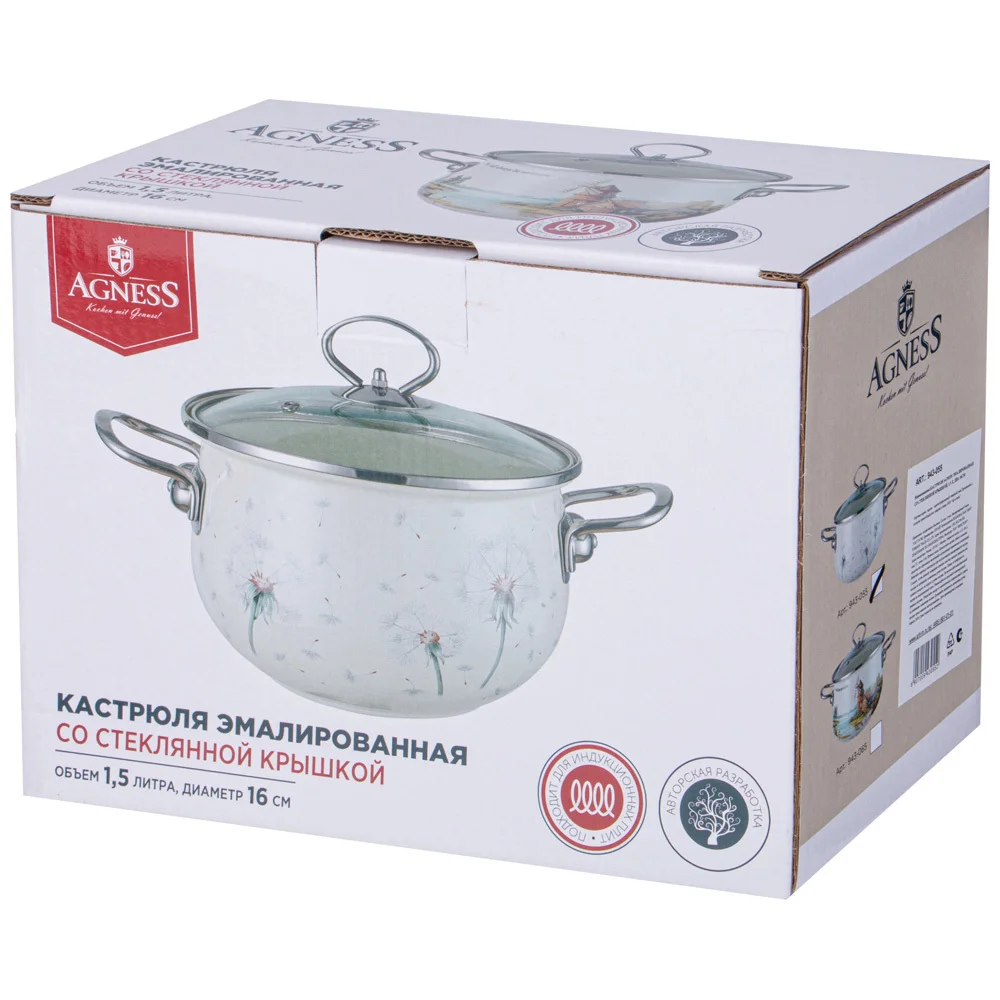 Кастрюля Agness Эмалированная Со Стеклянной Крышкой, 1,5 Л Диа.16см. 943-055