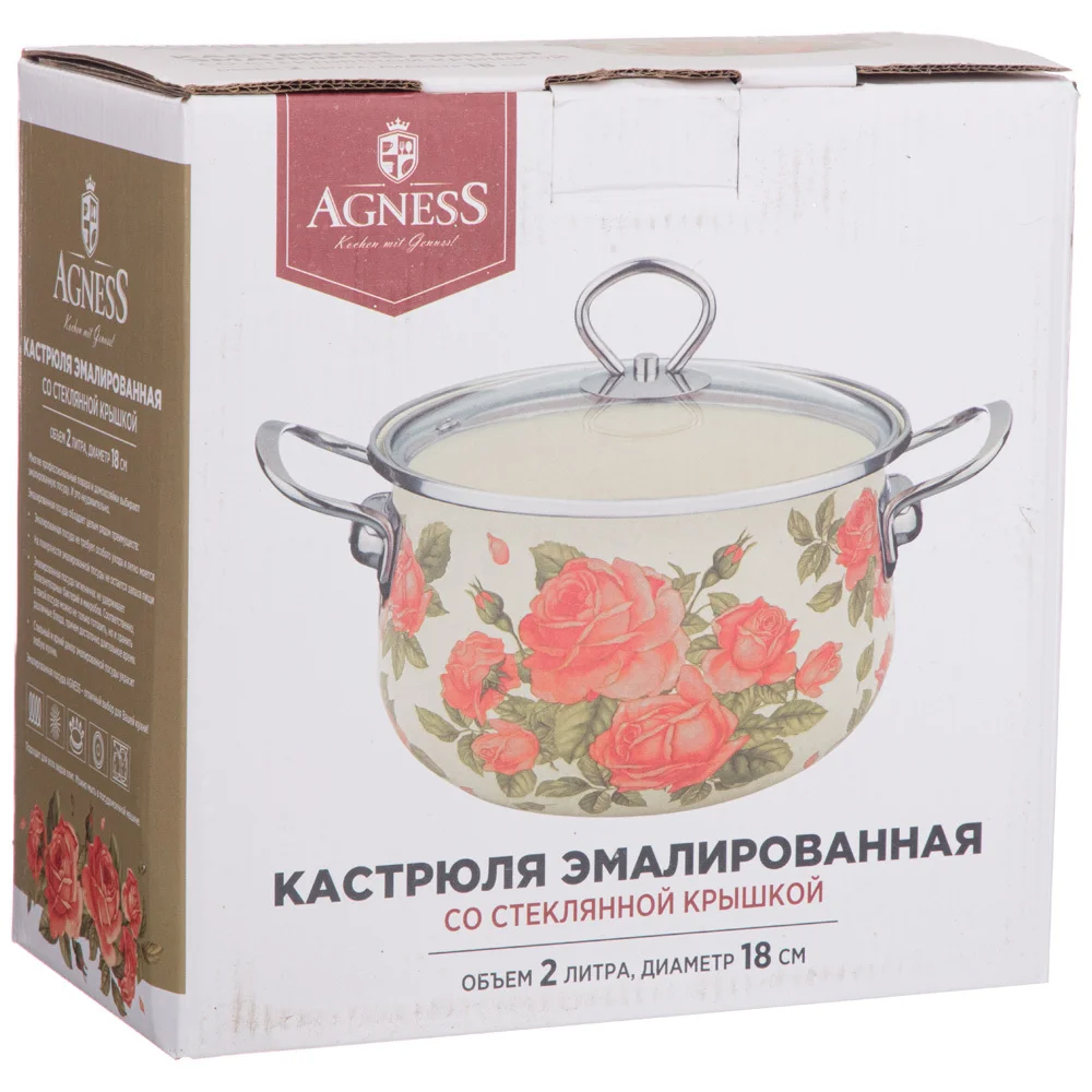 Эмалированная посуда AGNESS - отличный выбор для Вашей кухни! Многие профессиональные повара и домохозяйки выбирают эмалированную посуду. И это не удивительно. Эмалированная посуда обладает целым рядом преимуществ: • Эмалированная посуда не требует особого ухода и легко моется • На поверхности эмалированной посуды не остается запаха пищи. • Эмалированная посуда гигиенична - не удерживает болезнетворных бактерий и микробов. Соответственно в такой посуде можно не только готовить, но и хранить различные блюда, причем достаточно длительное время. • Стильный и нежный декор эмалированной посуды украсит любую кухню. • Посуда проходит 3 этапа обжига, эта технология позволяет сохранить яркость расцветок деколи, а также придает прочность эмалированной посуде • Все деколи наносятся вручную, а затем обжигаются при температуре около 800 С • Подходит для всех типов плит, включая ИНДУКЦИОННЫЕ. Стеклянная крышка с паровыпуском. Можно мыть в посудомоечной машине. • Толщина корпуса и дна без эмалированного покрытия 1,2мм. • Диаметр кастрюли 20см, высота 12см, диаметр дна 13см и ширина с ручками 28 см. Правила ухода за эмалированной посудой просты: • Не использовать абразивные чистящие средства; • Мыть с применением нейтральных моющих средств, подходит для мытья в посудомоечной машине; • Избегать резкого перепада температур. • Не нагревать пустую посуду, а также не допускать выкипания воды. Эмалированные кастрюли не подходят для жарки блюд. • При транспортировке, хранение и спользовании необходимо оберегать эмалированную посуду от механических повреждений