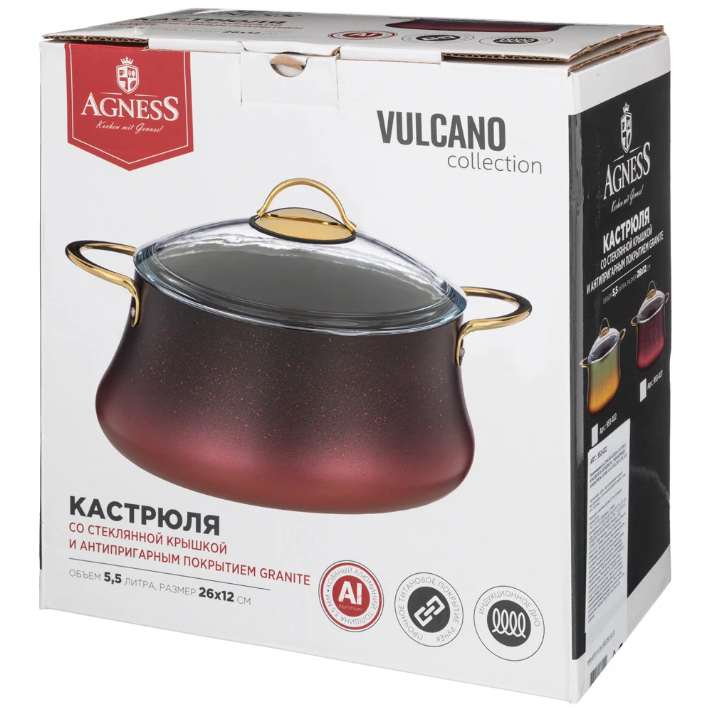 Марка AGNESS представляет посуду турецкого производителя серии Vulcano. Серия Vulcano - это стильная новая форма, интересное цветовое решения и высокое качество производства. Посуда выполнена из кованного алюминия. Благодаря этой технологии посуда становится более прочной, износостойкой и не подвержена деформации. Алюминий - один из лучших проводников, такая посуда быстро и равномерно нагреваются, а значит Ваши блюда готовятся быстро и не подгорают. Основные преимущества посуды серии Vulcano: * Антипригарное покрытие Granite внутри и снаружи. Блюда не прилипают во время готовки, а посуду легко мыть! * Прочное титановое покрытие ручек защищает металл от коррозии. Благодаря такому покрытию, посуду можно мыть в посудомоечной машине и она останется как новая. * Крышка выполнена из массивного термостойкого стекла * Подходит для всех видов плит, включая ИНДУКЦИОННЫЕ * Толщина корпуса 3,5мм Готовьте с удовольствием в посуде AGNESS! Рекомендации: Металлическая ручка может нагреваться. Используйте прихватку, чтобы не обжечься. Чтобы посуда прослужила как можно дольше, рекомендуется использовать деревянные или силиконовые лопатки. Не используйте острые кухонные аксессуары. Избегайте резких перепадов температур при использовании. Резкий перепад температур снижает антипригарные свойства покрытия. Не остужайте горячую посуду под струей холодной воды.