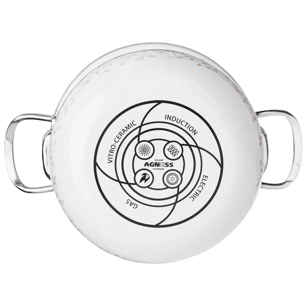 Эмалированная посуда AGNESS - отличный выбор для Вашей кухни! Многие профессиональные повара и домохозяйки выбирают эмалированную посуду. И это не удивительно. Эмалированная посуда обладает целым рядом преимуществ: • Эмалированная посуда не требует особого ухода и легко моется • На поверхности эмалированной посуды не остается запаха пищи. • Эмалированная посуда гигиенична - не удерживает болезнетворных бактерий и микробов. Соответственно в такой посуде можно не только готовить, но и хранить различные блюда, причем достаточно длительное время. • Стильный и нежный декор эмалированной посуды украсит любую кухню. • Посуда проходит 3 этапа обжига, эта технология позволяет сохранить яркость расцветок деколи, а также придает прочность эмалированной посуде • Все деколи наносятся вручную, а затем обжигаются при температуре около 800 С • Подходит для всех типов плит, включая ИНДУКЦИОННЫЕ. Стеклянная крышка с паровыпуском. Можно мыть в посудомоечной машине. • Толщина корпуса и дна без эмалированного покрытия 1,2мм. • Диаметр кастрюли 20см, высота 12см, диаметр дна 13см и ширина с ручками 28 см. Правила ухода за эмалированной посудой просты: • Не использовать абразивные чистящие средства; • Мыть с применением нейтральных моющих средств, подходит для мытья в посудомоечной машине; • Избегать резкого перепада температур. • Не нагревать пустую посуду, а также не допускать выкипания воды. Эмалированные кастрюли не подходят для жарки блюд. • При транспортировке, хранение и спользовании необходимо оберегать эмалированную посуду от механических повреждений