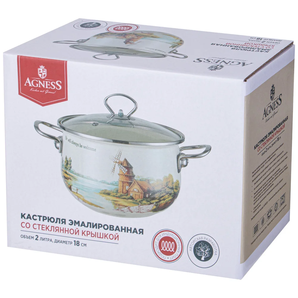 Эмалированная посуда AGNESS - отличный выбор для Вашей кухни! Многие профессиональные повара и домохозяйки выбирают эмалированную посуду. И это не удивительно. Эмалированная посуда обладает целым рядом преимуществ: • Эмалированная посуда не требует особого ухода и легко моется • На поверхности эмалированной посуды не остается запаха пищи. • Эмалированная посуда гигиенична - не удерживает болезнетворных бактерий и микробов. Соответственно в такой посуде можно не только готовить, но и хранить различные блюда, причем достаточно длительное время. • Стильный и нежный декор эмалированной посуды украсит любую кухню. • Посуда проходит 3 этапа обжига, эта технология позволяет сохранить яркость расцветок деколи, а также придает прочность эмалированной посуде • Все деколи наносятся вручную, а затем обжигаются при температуре около 800 С • Подходит для всех типов плит, включая ИНДУКЦИОННЫЕ. Стеклянная крышка с паровыпуском. Можно мыть в посудомоечной машине. • Толщина корпуса и дна без эмалированного покрытия 1,0мм. Правила ухода за эмалированной посудой просты: • Не использовать абразивные чистящие средства; • Мыть с применением нейтральных моющих средств, подходит для мытья в посудомоечной машине; • Избегать резкого перепада температур. • Не нагревать пустую посуду, а также не допускать выкипания воды. Эмалированные кастрюли не подходят для жарки блюд. • При транспортировке, хранение и спользовании необходимо оберегать эмалированную посуду от механических повреждений • проверять надежность крепления ручек перед каждым использоваием