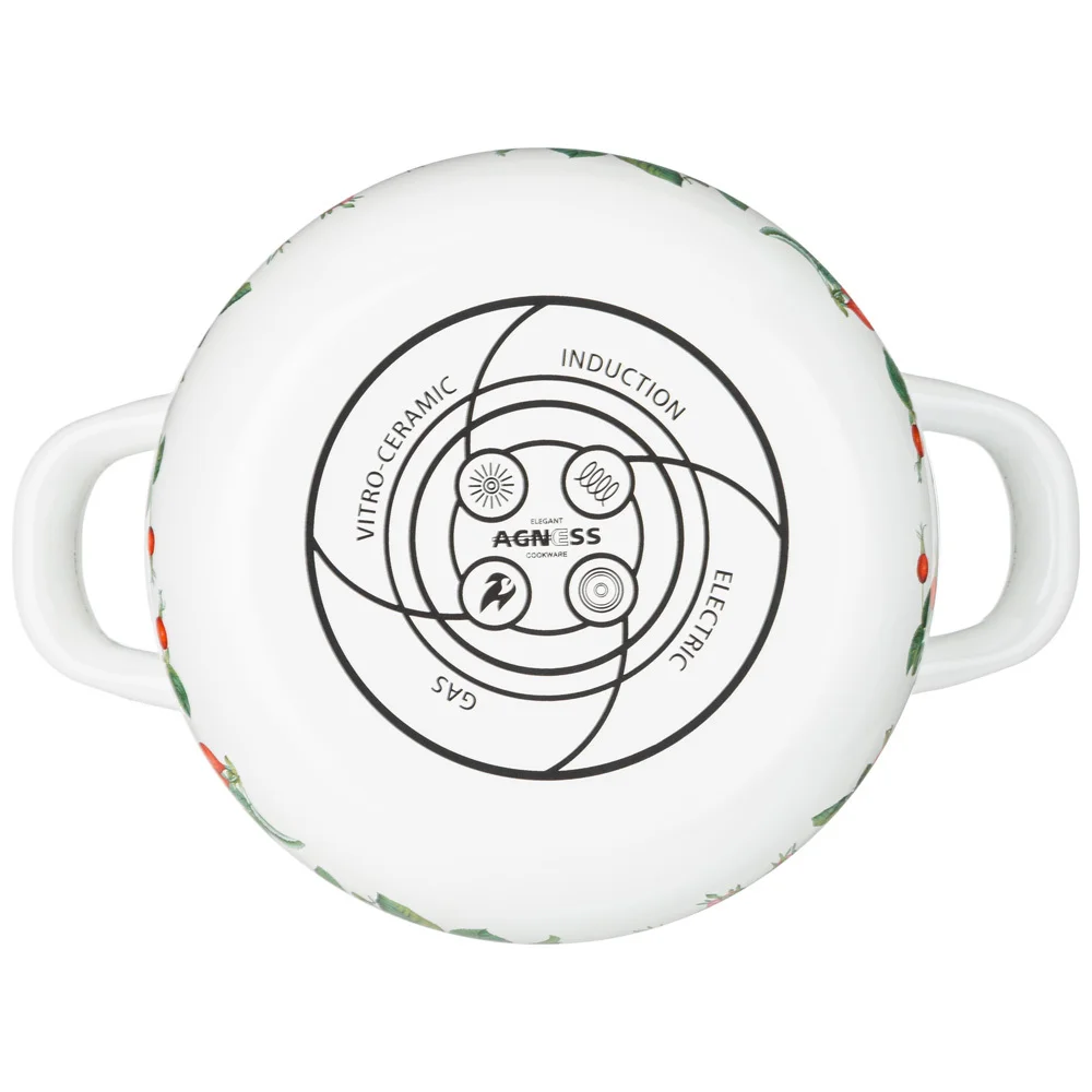 Эмалированная посуда AGNESS - отличный выбор для Вашей кухни! Многие профессиональные повара и домохозяйки выбирают эмалированную посуду. И это не удивительно. Эмалированная посуда обладает целым рядом преимуществ: * Эмалированная посуда не требует особого ухода и легко моется * Эмалированная посуда гигиенична - не удерживает болезнетворных микробов и бактерий * На поверхности эмалированной посуды не остается запаха пищи * В эмалированной посуде можно не только готовить, но и хранить приготовленные блюда, причем довольно долгое время * Подходит для всех типов плит, включая индукционные * Можно мыть в посудомоечной машине * Толщина стенок 0,5мм • Посуда проходит 3 этапа обжига, эта технология позволяет сохранить яркость расцветок деколи, а также придает прочность эмалированной посуде • Все деколи наносятся в ручную, а затем обжигаются при температуре около 800 С Стильный и нежный декор эмалированной посуды украсит любую кухню. Высота кастрюли 10 см, диаметр 16 см, диаметр дна 12 см и ширина с ручками 21 см.