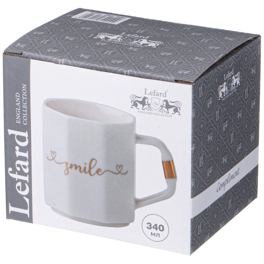 Кружка TM Lefard с лаконичным дизайном и надписью SMILE имеет удобную ручку и отличный объем 340мл. Кружка изготовлена из качественного фарфора. Отличный выбор для подарка. Продукция сертифицирована и безопасна для контакта с пищевыми продуктами.