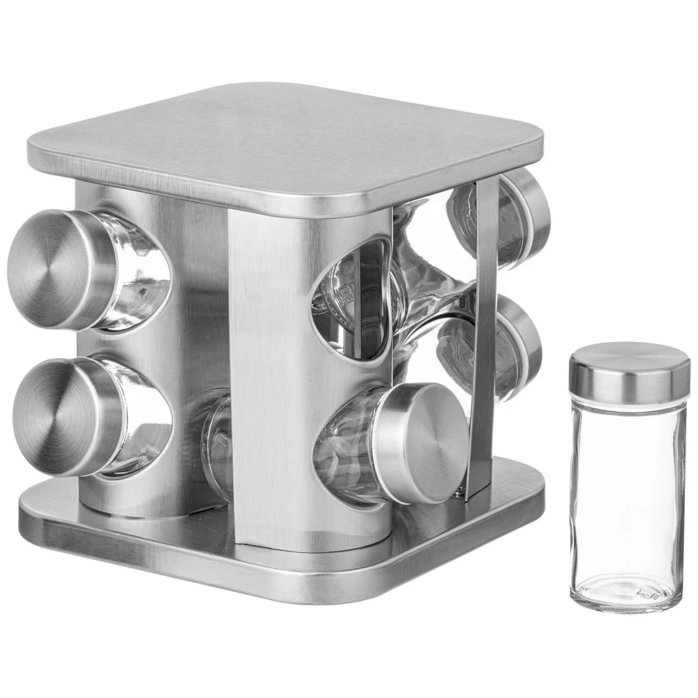 - Вращающаяся подставка облегчает доступ к каждой баночке, что позволяет быстро найти нужную специю.
