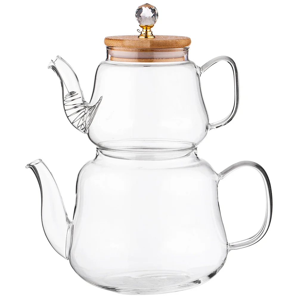 Набор для чаепития из 2-х оригинальных стильных чайников, который выдерживает высокую температуру кипящей воды.: нижний чайник объемом 1,5 л используется для кипятка, верхний чайник объемом 630 мл используется как заварочный. В таком наборе заваривание чая или трав особенное, так как происходит процесс настаивания на паровой бане, что позволяет плавно раскрывать и сохранять всю ценность напитка. Изделия выполнены из экологически чистого жаропрочного стекла и подходят для использования на стеклокерамической, электрической варочной поверхности, на газовых плитах необходимо дополнительно использовать рассекатель. Крышка имеет уплотнительное силиконовое кольцо, благодаря которому она надежно фиксируется на чайнике. Фильтр из нержавеющей стали в заварочном чайнике препятствует попаданию трав из чайника в чашку. Ручка имеет очень удобною форму для надежного захвата. Кноб на крышке в форме кристалла из акрила, благодаря бликам и сиянию создает неповторимую уютную, радостную атмосферу во время чаепития. Набор служит украшением стола и будет прекрасным подарком родным и близким. Набор упакован в подарочную упаковку. Внимание: не рекомендуется ставить чайник с холодной жидкостью на раскаленную нагревательную поверхность. Стекло должен прогреться постепенно, чтобы передать тепло по всей поверхности дна равномерно