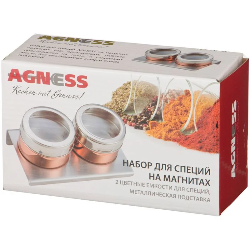 Набор для специй AGNESS – это отличное решение, позволяющее удобно использовать специи и приправы во время приготовления. Засыпанные в емкость специи, их вид и количество видно сквозь прозрачную крышку. Дозировать порцию специй очень легко: по боковой стенке крышки есть два вида отверстий - большего и меньшего размера и достаточно лишь прокрутить крышку до нужного отверстия, чтобы получить нужное количество. Крышка закрывается плотно, тем самым защищая специи от влаги и выветривания аромата. Каждая емкость для специй оснащена магнитом, вмонированным в дно, что позволяет при необходимости закрепить ее на любой другой металлической поверхности, например, дверце холодильника или металлической вытяжке над плитой. Коллекционный дизайн "ROSSO" позволяет поддерживать интерьер в едином стиле. ТМ AGNESS - готовьте с удовольствием!