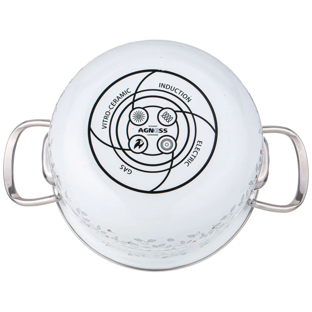 Эмалированная посуда AGNESS - отличный выбор для Вашей кухни! Многие профессиональные повара и домохозяйки выбирают эмалированную посуду. И это не удивительно. Эмалированная посуда обладает целым рядом преимуществ: • Эмалированная посуда не требует особого ухода и легко моется • На поверхности эмалированной посуды не остается запаха пищи. • Эмалированная посуда гигиенична - не удерживает болезнетворных бактерий и микробов. Соответственно в такой посуде можно не только готовить, но и хранить различные блюда, причем достаточно длительное время. • Стильный и нежный декор эмалированной посуды украсит любую кухню. • Посуда проходит 3 этапа обжига, эта технология позволяет сохранить яркость расцветок деколи, а также придает прочность эмалированной посуде • Все деколи наносятся вручную, а затем обжигаются при температуре около 800 С • Подходит для всех типов плит, включая ИНДУКЦИОННЫЕ. Стеклянная крышка с паровыпуском. Можно мыть в посудомоечной машине. • Толщина корпуса и дна без эмалированного покрытия 1,2мм. Размер кастрюль: Кастрюля 2,0Л: диаметр 18см, высота 11см, диаметр дна 13см и ширина с ручками 26 см. Кастрюля 2,8Л: диаметр 20см, высота 12см, диаметр дна 13см и ширина с ручками 28 см. Правила ухода за эмалированной посудой просты: • Не использовать абразивные чистящие средства; • Мыть с применением нейтральных моющих средств, подходит для мытья в посудомоечной машине; • Избегать резкого перепада температур. • Не нагревать пустую посуду, а также не допускать выкипания воды. Эмалированные кастрюли не подходят для жарки блюд. • При транспортировке, хранение и спользовании необходимо оберегать эмалированную посуду от механических повреждений