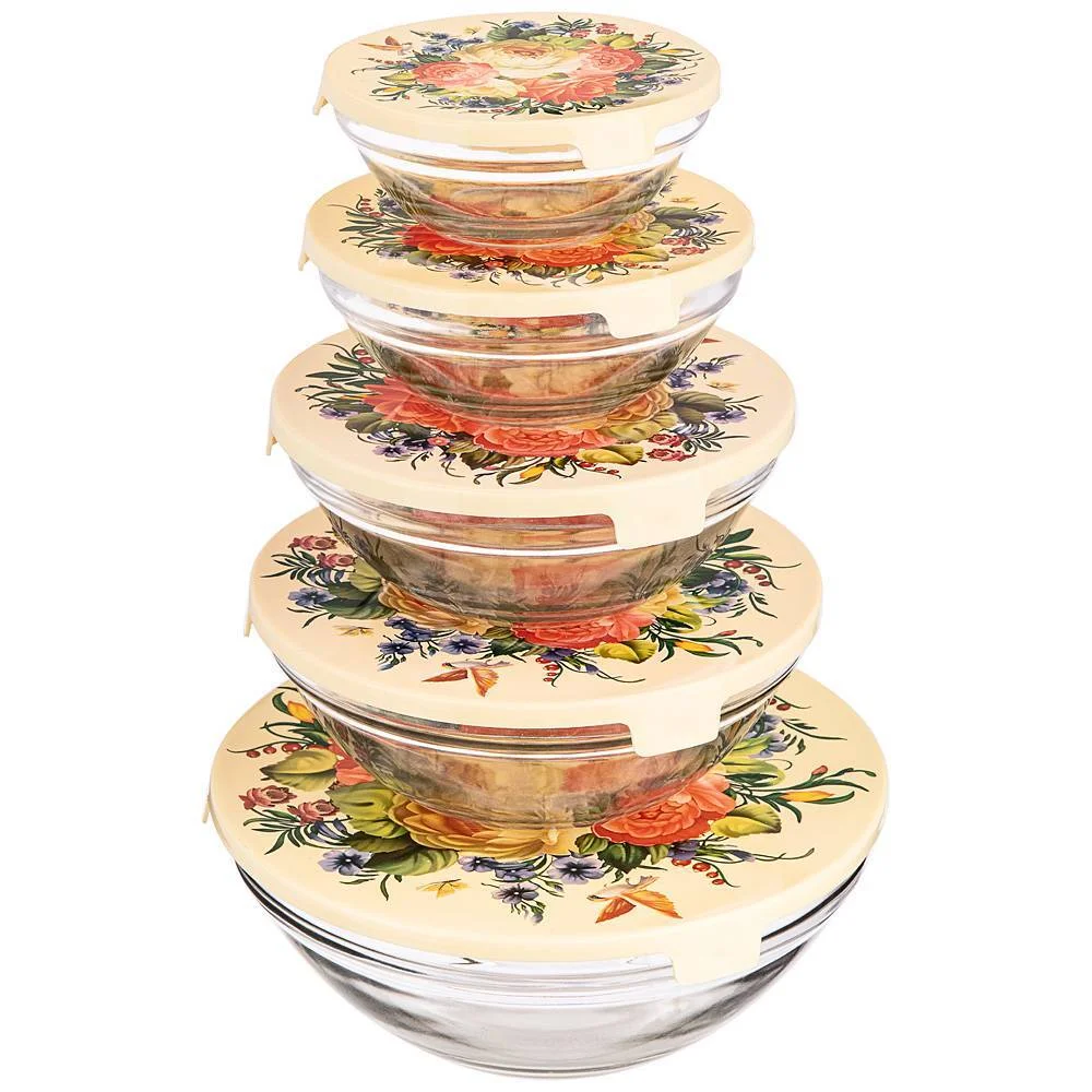 Набор из пяти мисок с крышками поможет в организации хранения продуктов, а также украсит Ваш интерьер в едином стиле. Сквозь прозрачный стекляннный корпус видно содержимое в ёмкости. Крышка с красивым коллекционным принтом "Роскошный сад" плотно закрывается и надежно защищает хранящиеся внтури продукты от выветривания. Плотная полимерная крышка сохраняет все ароматы внутри, не позволяет внешим инородным предметам и веществам попасть внутрь ёмкости. Миски имеют разный объем и при хранении друг в друге занимают очень мало места. Такой набор станет не только удобным дополнением Ваших кухонныъх принадлежностей для хранения продуктов, но будет всегда желанным подарком для Ваших родных и близких.