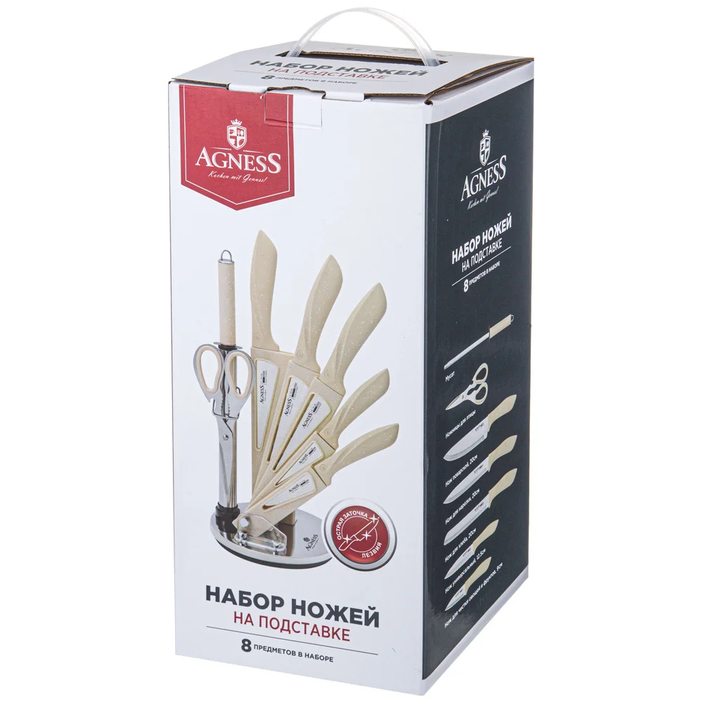 Нож - главный инструмент на кухне, а вернее ножи, т.к. даже самый лучший нож не сможет справиться со всем многообразием задач. Выбирая набор ножей AGNESS - Вы приобретаете комплект самых необходимых и чаще всего используемых ножей. Преимущества ножей AGNESS: ● Эргономичная ручка для удобной нарезки ● 2-х стороняя заточка лезвия ● Удобная вращающаяся подставка ● Для экономии рабочего пространства Вы легко можете сложить подставку ● Состав набора: Нож поварской 20см, Нож для хлеба 20см, Нож для нарезки 20см, Нож универсальный 12,5см, Нож для чистки овощей и фруктов, 9см, Муссат, Ножницы, Пластиковая подставка для безопасного хранения ножей Рекомендована ручная мойка.