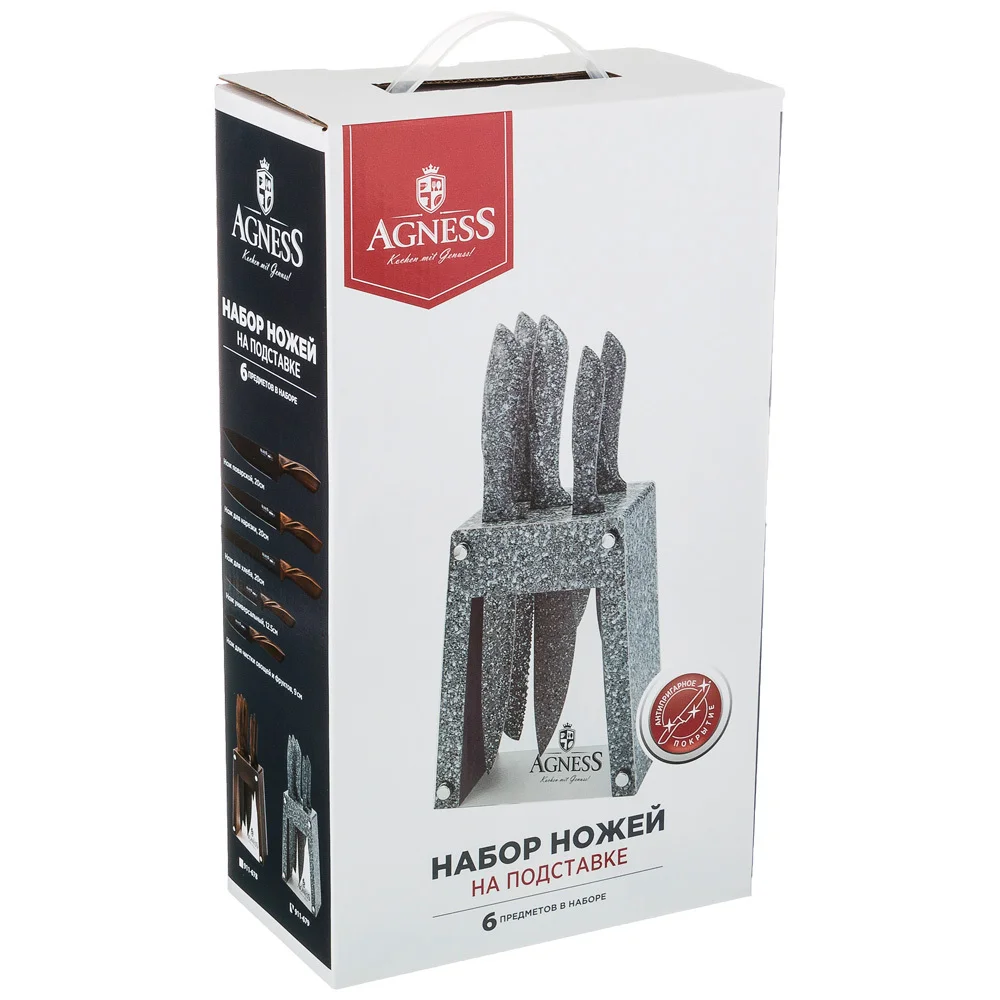 Нож - главный инструмент на кухне, а вернее ножи, т.к. даже самый лучший нож не сможет справиться со всем многообразием задач. Выбирая набор ножей AGNESS - Вы приобретаете комплект самых необходимых и чаще всего используемых ножей. Преимущества ножей AGNESS: ● Эргономичная ручка с покрытием Soft Touch для удобной нарезки ● Лезвие из высокоуглеродистой коррозионной стали ● 2-х стороняя заточка лезвия ● Стильный дизайн ● Состав набора: Нож поварской 20см, Нож для хлеба 20см, Нож для нарезки 20см, Нож универсальный 12,5см, Нож для чистки овощей и фруктов, 9см, Удобная подставка для безопасного хранения ножей Рекомендована ручная мойка.