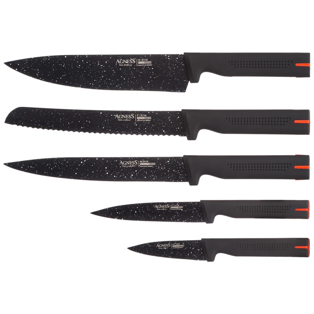 Нож - главный инструмент на кухне, а вернее ножи, т.к. даже самый лучший нож не сможет справиться со всем многообразием задач. Выбирая набор ножей AGNESS - Вы приобретаете комплект самых необходимых и чаще всего используемых ножей. Преимущества ножей AGNESS: ● Эргономичная ручка для удобной нарезки ● 2-х стороняя заточка лезвия ● Деревянная подставка для безопасного хранения ножей ● Состав набора: Нож поварской 20см, Нож для хлеба 20см, Нож для нарезки 20см, Нож универсальный 12,5см, Нож для чистки овощей и фруктов, 9см, Деревянная подставка Рекомендована ручная мойка.