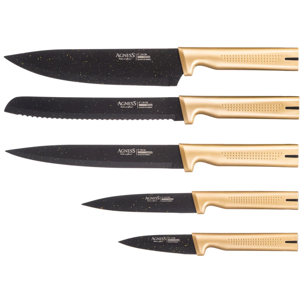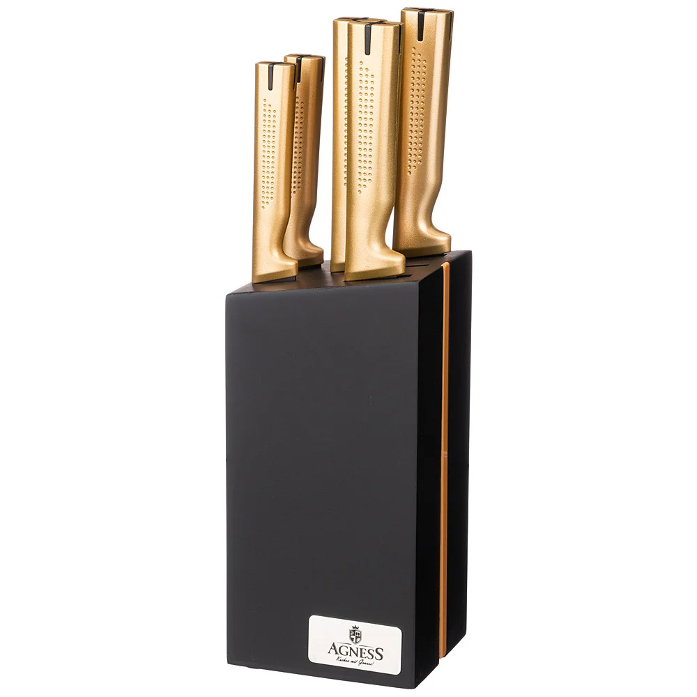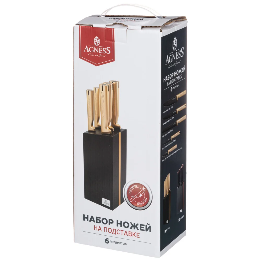 Нож - главный инструмент на кухне, а вернее ножи, т.к. даже самый лучший нож не сможет справиться со всем многообразием задач. Выбирая набор ножей AGNESS - Вы приобретаете комплект самых необходимых и чаще всего используемых ножей. Преимущества ножей AGNESS: ● Эргономичная ручка для удобной нарезки ● 2-х стороняя заточка лезвия ● Деревянная подставка для безопасного хранения ножей ● Состав набора: Нож поварской 20см, Нож для хлеба 20см, Нож для нарезки 20см, Нож универсальный 12,5см, Нож для чистки овощей и фруктов, 9см, Деревянная подставка Рекомендована ручная мойка.