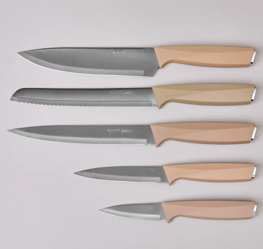 Нож - главный инструмент на кухне, а вернее ножи, т.к. даже самый лучший нож не сможет справиться со всем многообразием задач. Выбирая набор ножей AGNESS - Вы приобретаете комплект самых необходимых и чаще всего используемых ножей. Преимущества ножей AGNESS: ● Лезвие из коррозионностойкой стали ● Эргономичная ручка с покрытием Soft Touch для удобной нарезки ● 2-х стороняя заточка лезвия ● Удобная подставка ● Для экономии рабочего пространства Вы легко можете хранить все ножи в подставке Рекомендована ручная мойка.