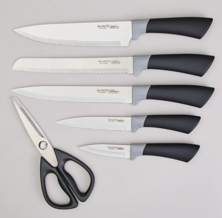 Набор ножей Agness на пластиковой подставке (артикул 911-778) — это комплект из 7 предметов, предназначенный для повседневной кулинарии. Ножи изготовлены из нержавеющей стали, а подставка — из пластика.