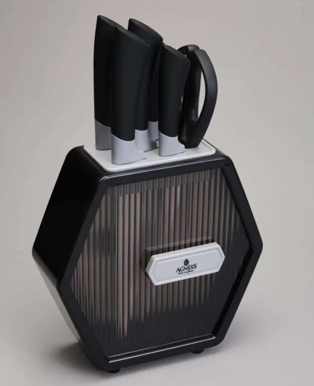 - Пластиковая подставка способствует безопасному хранению ножей и экономии пространства.