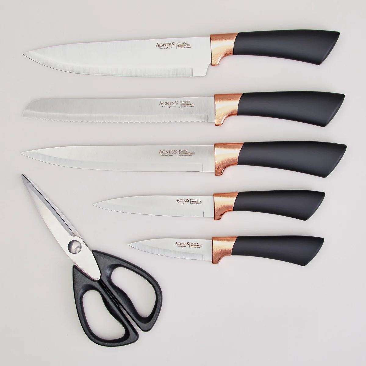 Нож - главный инструмент на кухне, а вернее ножи, т.к. даже самый лучший нож не сможет справиться со всем многообразием задач. Выбирая набор ножей AGNESS - Вы приобретаете комплект самых необходимых и чаще всего используемых ножей. Преимущества ножей AGNESS: ● Эргономичные ручки ● Лезвие из коррозионностойкой стали с 2-х стороней заточкой ● Удобная пластиковая подставка. ● Состав набора: Нож поварской 20см, Нож для нарезки 20см, Нож для хлеба 20см, Нож универсальный 12,5см, Нож для чистки овощей и фруктов 9см, Ножницы для птицы. Рекомендована ручная мойка.