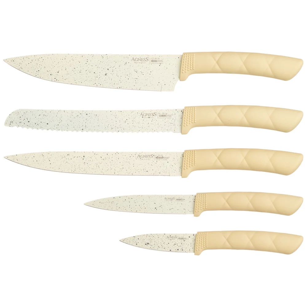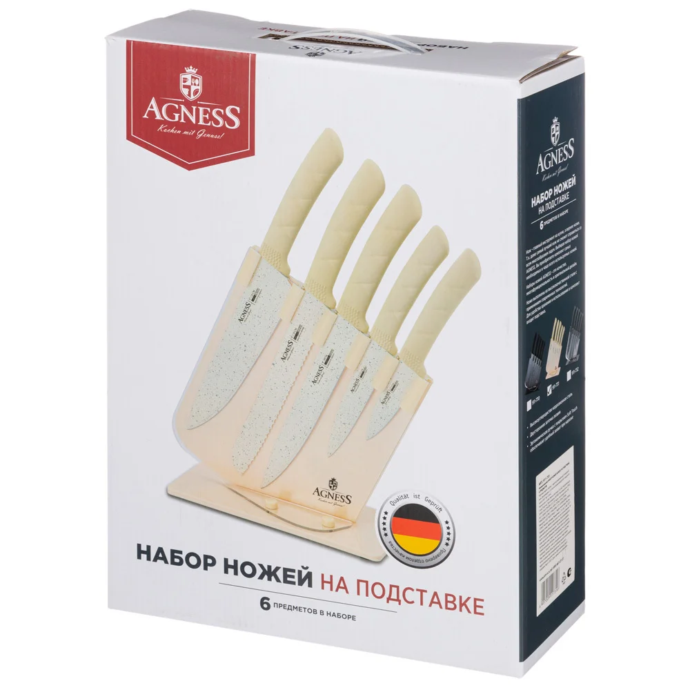 Нож - главный инструмент на кухне, а вернее ножи, т.к. даже самый лучший нож не сможет справиться со всем многообразием задач. Выбирая набор ножей AGNESS - Вы приобретаете комплект самых необходимых и чаще всего используемых ножей. Преимущества ножей AGNESS: ● Удобная ручка с покрытием Soft Touch обеспечивает удобный захват при нарезке ● Лезвие из высокоуглеродистой коррозионной стали c "мраморным" покрытием, благодаря которому продукты не прилипают во время нарезки ● 2-х стороняя заточка лезвия ● Состав набора: Нож поварской 20см, Нож для нарезки 20см, Нож для хлеба 20см, Нож универсальный 12,5см, Нож для чистки овощей и фруктов, 9см, Удобная пластиковая подставка для безопасного хранения ножей. Рекомендована ручная мойка.