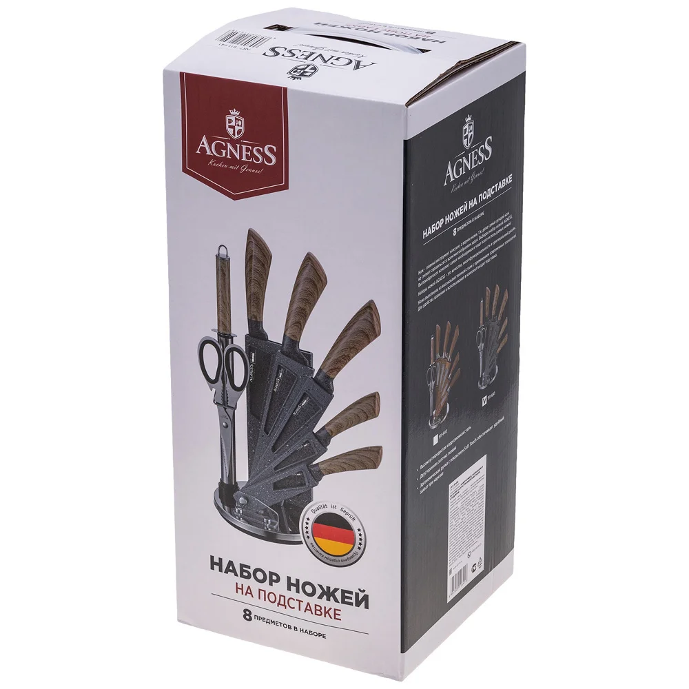 Нож - главный инструмент на кухне, а вернее ножи, т.к. даже самый лучший нож не сможет справиться со всем многообразием задач. Выбирая набор ножей AGNESS - Вы приобретаете комплект самых необходимых и чаще всего используемых ножей. Преимущества ножей AGNESS: ● Лезвие из высокоуглеродистой коррозионной стали ● Эргономичная ручка с покрытием Soft Touch для удобной нарезки ● 2-х стороняя заточка лезвия ● Удобная вращающаяся подставка ● Для экономии рабочего пространства Вы легко можете сложить подставку ● Состав набора: Топорик 17см, Нож поварской 20см, Нож для нарезки 20см, Нож универсальный 12,5см, Нож для чистки овощей и фруктов, 9см, Муссат, Ножницы, Складывающаяся вращающаяся пластиковая подставка для безопасного хранения ножей. Рекомендована ручная мойка.