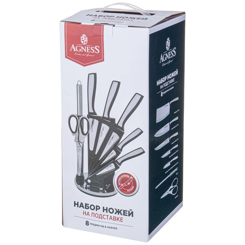 Нож - главный инструмент на кухне, а вернее ножи, т.к. даже самый лучший нож не сможет справиться со всем многообразием задач. Выбирая набор ножей AGNESS - Вы приобретаете комплект самых необходимых и чаще всего используемых ножей. Преимущества ножей AGNESS: ● Эргономичная ручка для удобной нарезки ● 2-х стороняя заточка лезвия ● Удобная вращающаяся подставка ● Для экономии рабочего пространства Вы легко можете сложить подставку ● Состав набора: Нож поварской 20см, Нож для хлеба 20см, Нож для нарезки 20см, Нож универсальный 12,5см, Нож для чистки овощей и фруктов, 9см, Муссат, Ножницы, Пластиковая подставка для безопасного хранения ножей Рекомендована ручная мойка.