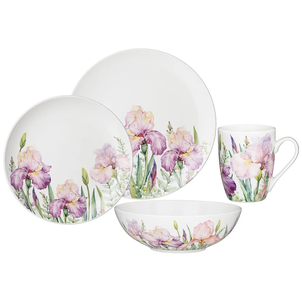 TM Lefard коллекция "Ирисы" - это эксклюзивная коллекция нежных ирисов на модных формах. Первый цветок ириса появился где-то в юго-восточной Азии в древние времена. Ирис был так красив, что им любовались и звери, и птицы, и воды, и ветры. Они разнесли семена этого необычного цветка по всему миру. И теперь благодаря им мы любуемся разнообразием этих красивых цветов. Качественный тонкостенный фарфор, "живые" натуральные цвета декора, красочная упаковка делают предметы коллекции прекрасным подарком к любому случаю. Продукция сертифицирована. Безопасна для контакта с пищевыми продуктами. Можно ставить в микроволновую печь, мыть в посудомоечной машине. Комплектность: тарелка обеденная 27 см - 4 шт., тарелка десертная 20,5 см - 4 шт., салатник-тарелка суповая - 4шт., кружка - 4 шт.