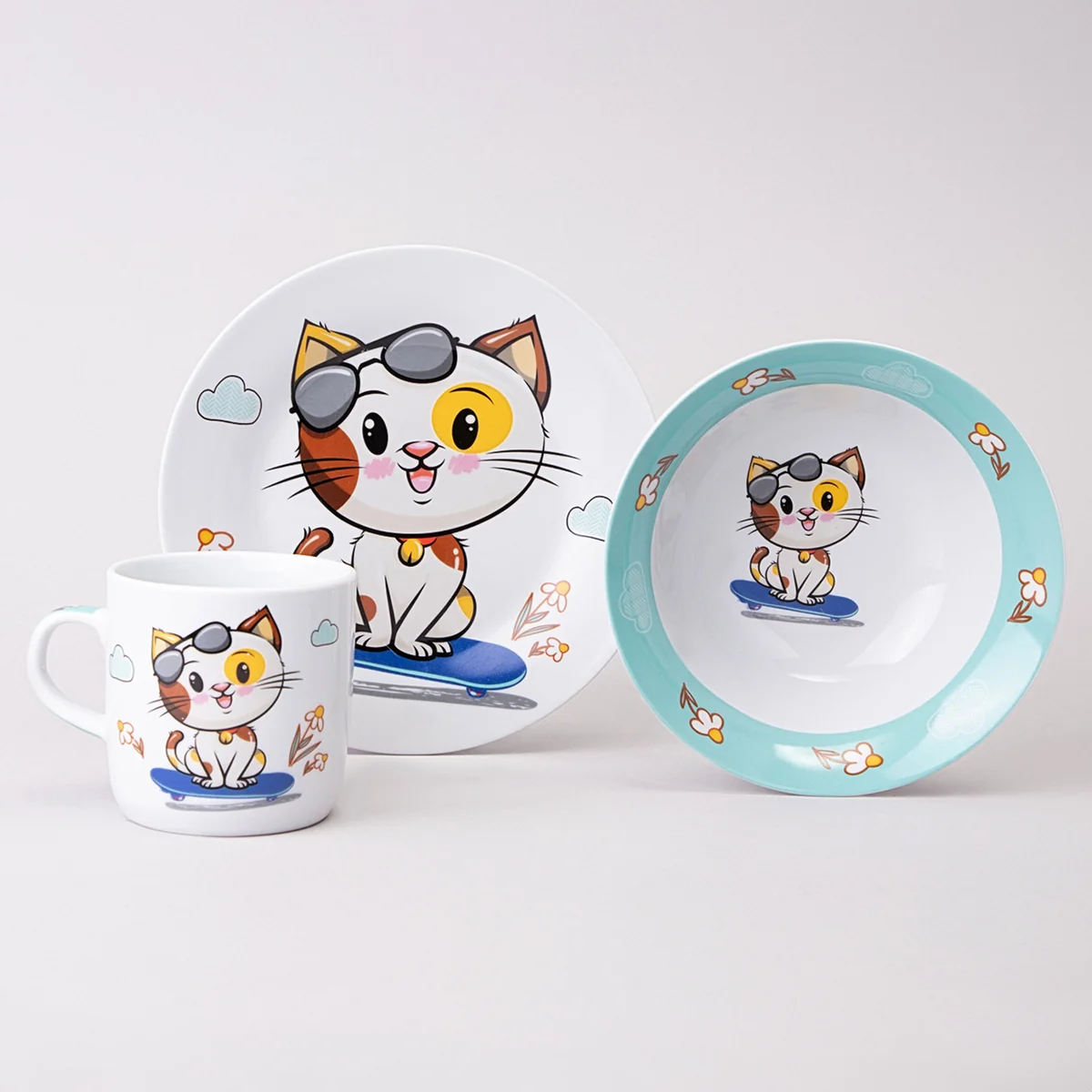В наборе: тарелка ; тарелка суповая ; кружка Рекомендации по уходу: можно мыть в посудомоечной машине; можно использовать в СВЧ Материал - фарфор Создайте уникальную атмосферу волшебства и радости во время приема пищи для ваших любимых крох с ярким набором детской посуды. Кроме того, посуда выдерживает нагрев в микроволновой печи, что делает ее еще более удобной в использовании.