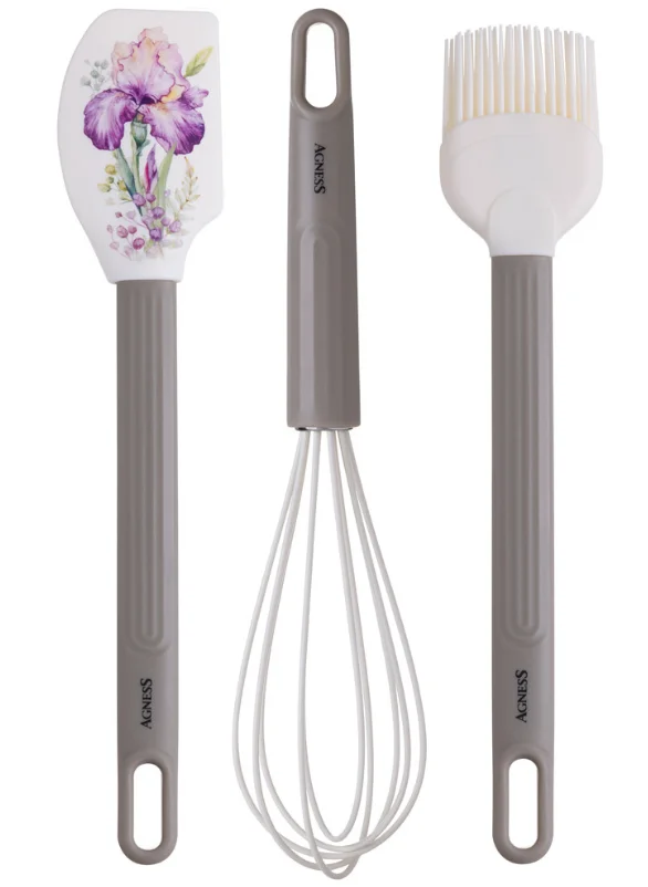 Набор Agness 671-031 — это комплект из трёх кухонных аксессуаров: венчика, лопатки и кисточки, выпущенный в серии Irises. Набор предназначен для приготовления пищи и выпечки.