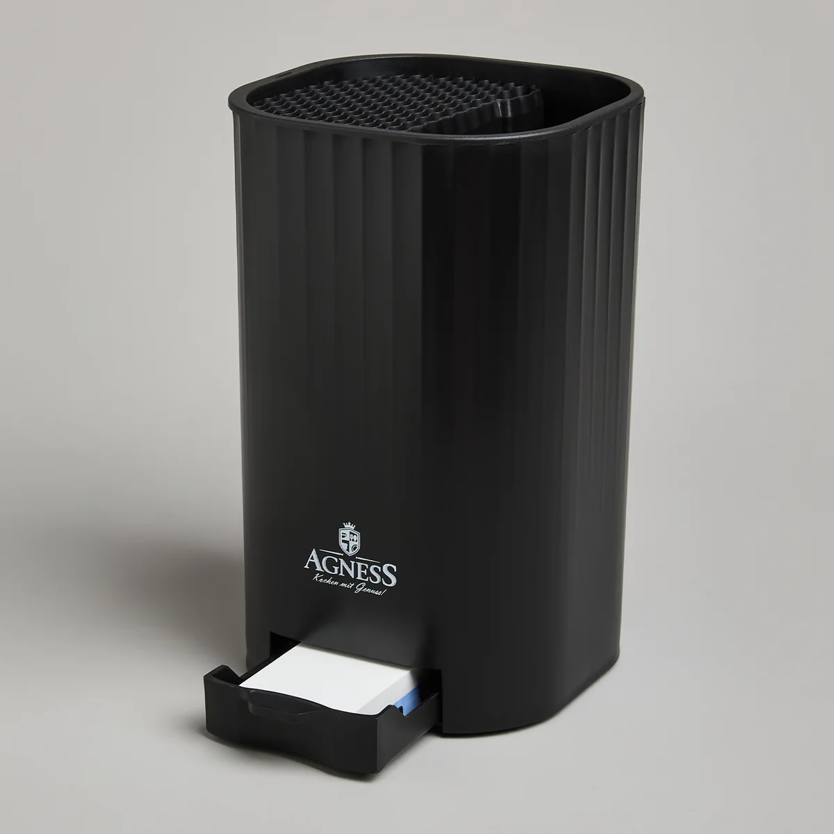 ПОДСТАВКА ДЛЯ НОЖЕЙ - необходимый аксессуар на каждой кухне. Подставка AGNESS легко и удобно решает проблему хранения ножей. * Сохраняет остроту кромки ножа. * Подходит для ножей разной длины * Компактное хранение ножей и кухонных аксессуаров * Легко чистить и мыть. Верхняя часть съемная * Точильный камень в комплекте Точильный камень имеет 2 уровеня заточки. 800/2000 грит 800 грит - для выравнивания лезвия 2000 грит - для остроты лезвия Перед началом заточки точильный камень необходимо смочить водой. Начинайте заточку ножей со стороны, обладающей большей зернистостью (800 грит), затем перейдите на мелкозернистую сторону (2000 грит).