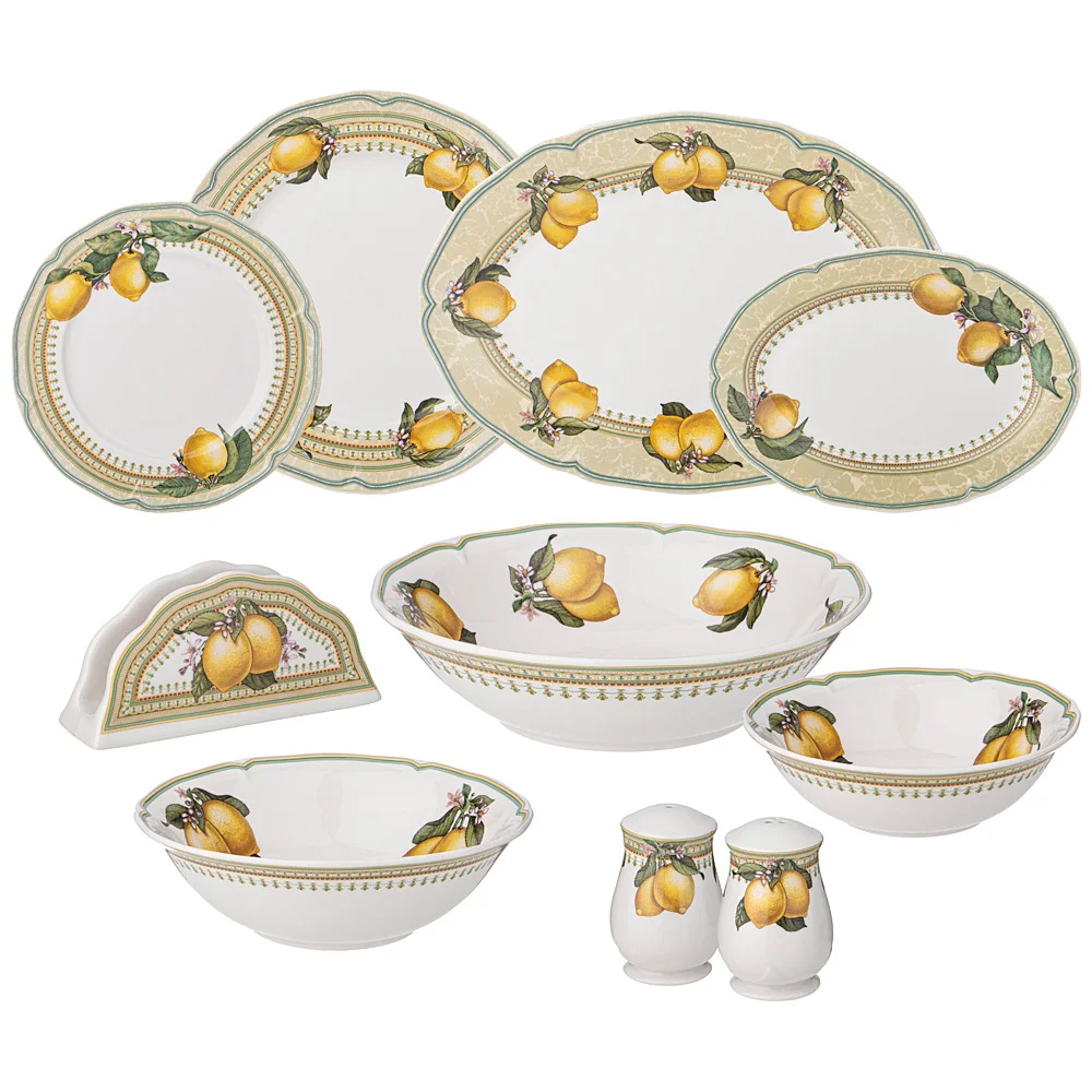 ТМ LEFARD авторская коллекция «Лимоны» - это вкус и элегантность в сервировке стола и несомненное украшение в интерьере кухни. Изделия выполнены из тонкого, легкого и прочного магнезийного фарфора, способны красиво звучать. При постукивании деревянной палочкой по стенкам фарфоровой чашки она отзовется долгим чистым звуком, как если бы вы держали в руке колокольчик. Красивая деколь, сочетающая оригинальный орнамент с выразительными лимонами. Натуральные, приятные глазу оттенки, всегда в тренде. Мягкие формы и удобные размеры и объемы посуды помогут сервировать стол и создадут непринужденную домашнюю атмосферу. Красочная упаковка. Прекрасный подарок. Продукция прошла сертификацию и безопасна для контакта с пищевыми продуктами. Можно смело мыть в посудомоечной машине с применением мягких моющих средств, использовать в микроволновой печи. Комплектность: тарелки обеденные 27 см - 6 шт, тарелки закусочные - 20,5 см - 6 шт; салатники 15 см - 6 шт; салатник 18 см - 1шт; салатник сервировочный 23 см - 1 шт; блюдо овальное 25,5 см - 1 шт; блюдо овальное 30,5 см - 1шт; салветница - 1 шт; набор соль перец - 1 шт;
