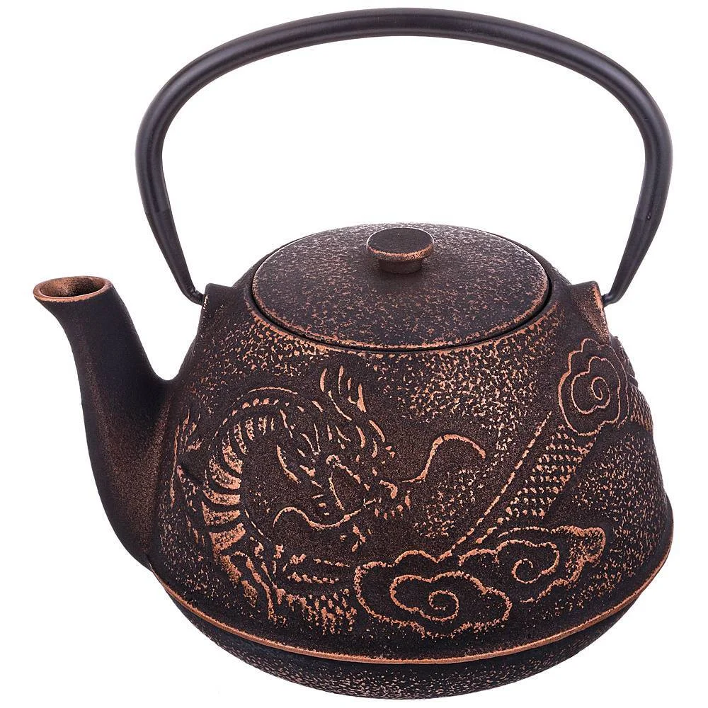 Устройте себе настоящую чайную церемонию с традиционным чугунным заварочным чайником. Внутренняя поверхность чайника покрыта эмалью, которая надежно защищает чайник от ржавчины и препятствует возникновению металлического привкуса у напитка, в связи с чем чайник идеально подойдет для заваривания Вашего любимого пуэра, улуна, черного, травяного или ароматизированного чая, раскрывая всю полноту вкуса напитка. В комплекте идет ситечко, которое надежно удерживает заварку. Не смотря на свои маленькие компактные размеры, этот чайник вмещает в себя 1200 мл, а его презентабельный внешний вид будет выигрышно смотреться на любом празднике. Чугунный чайник не следует ставить на открытый огонь, газовые или электрические плиты во избежание повреждения его внешнего покрытия.