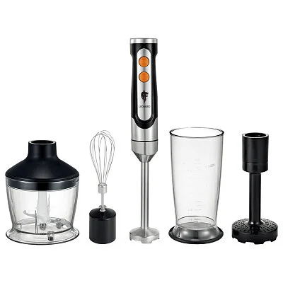 Мощность 800 Вт 2 скорости работы: Обычный и Turbo режим Регулировка скорости Насадка блендер из нержавеющей стали Ножи из нержавеющей стали Измельчитель 500 мл Венчик Стакан для смешивания 800 мл Насадка для картофельного пюре.