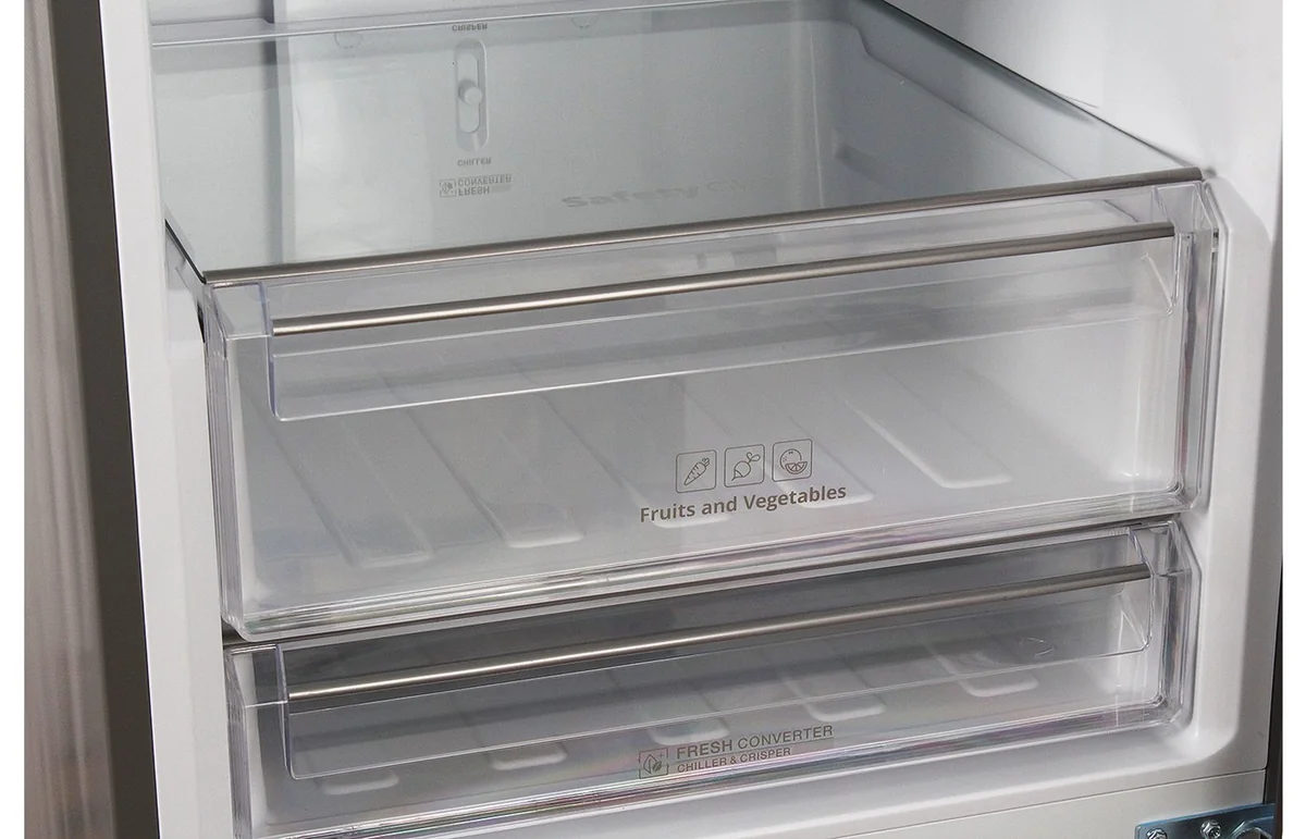 Теперь не нужно освобождать и извлекать полку, чтобы разместить открытую трёхлитровую банку или большую кастрюлю. Полка-трансформер складывается в одно движение и так же легко и быстро раскладывается. Вместительный ящик для овощей и фруктов отделен от основного пространства, благодаря этому температура в нём более стабильна и позволяет дольше сохранять их свежесть и пользу.