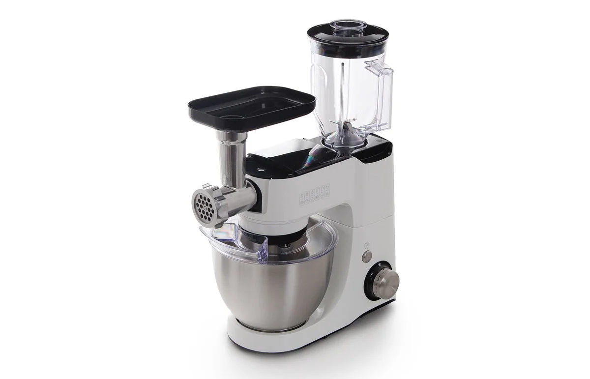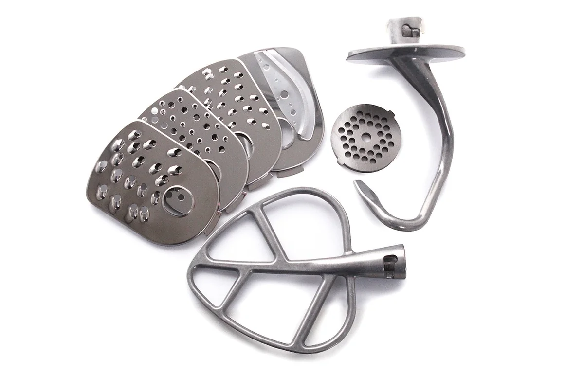 Насадки в комплекте: крюк для замешивания теста, венчик для жидкого теста, венчик для взбивания, измельчитель, блендер, мясорубка