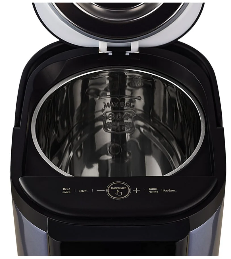Объём резервуара составляет 5 литров, этого будет достаточно даже для большой семьи. Благодаря мощности 1600 Вт повторное кипячение этого объёма займёт всего пару минут.