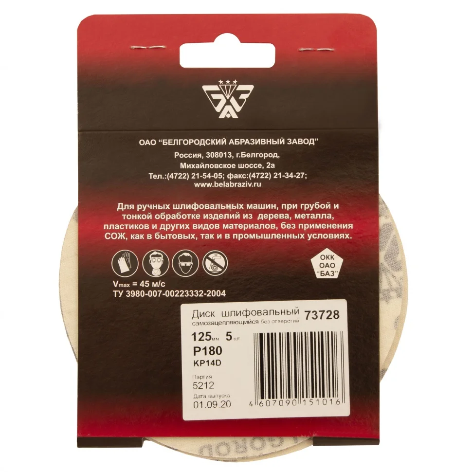 Диск шлифовальный под "липучку", KP14D, зернистость P 180, 6-Н, 125 мм, 5 шт, "БАЗ" Россия 73728