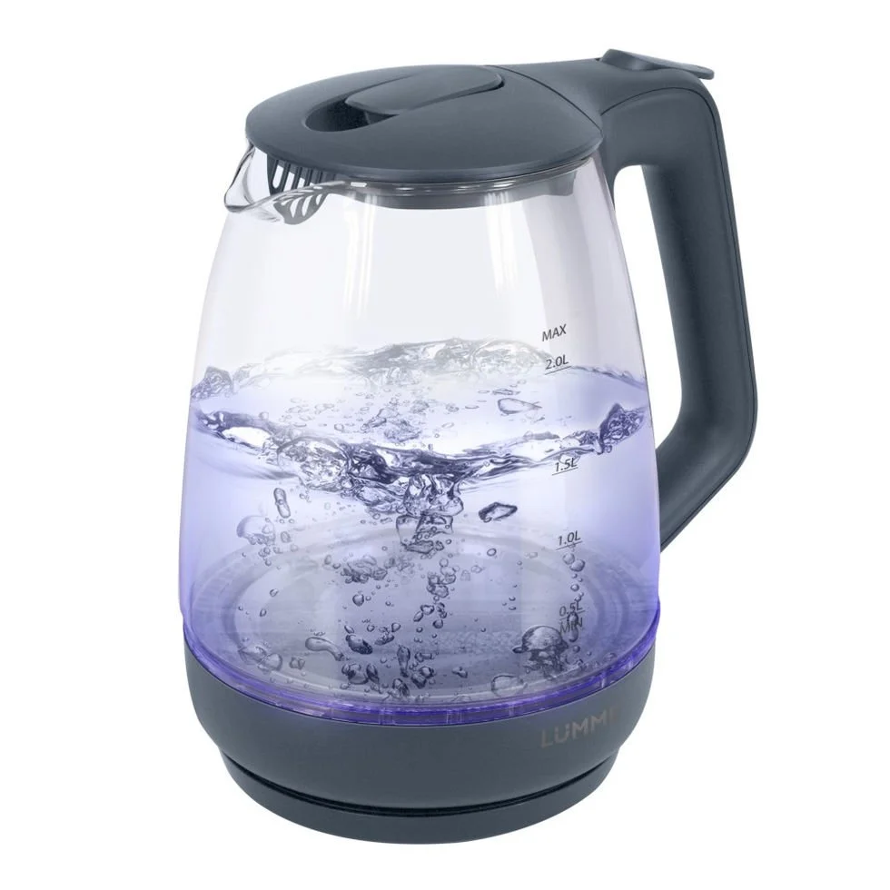 Легкий ударопрочный стеклянный чайник с голубой внутренней подсветкой в элегантном прозрачном корпусе из закаленного термостойкого стекла объемом 2 литра.
