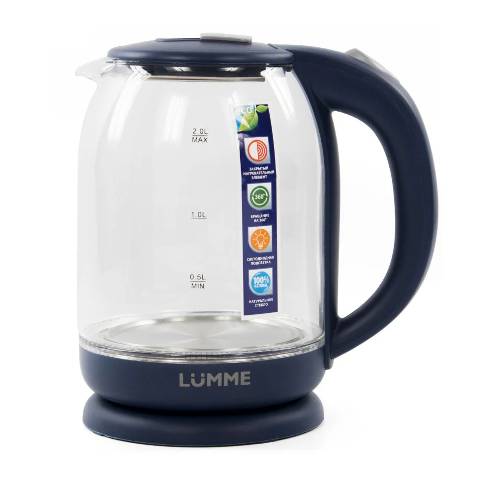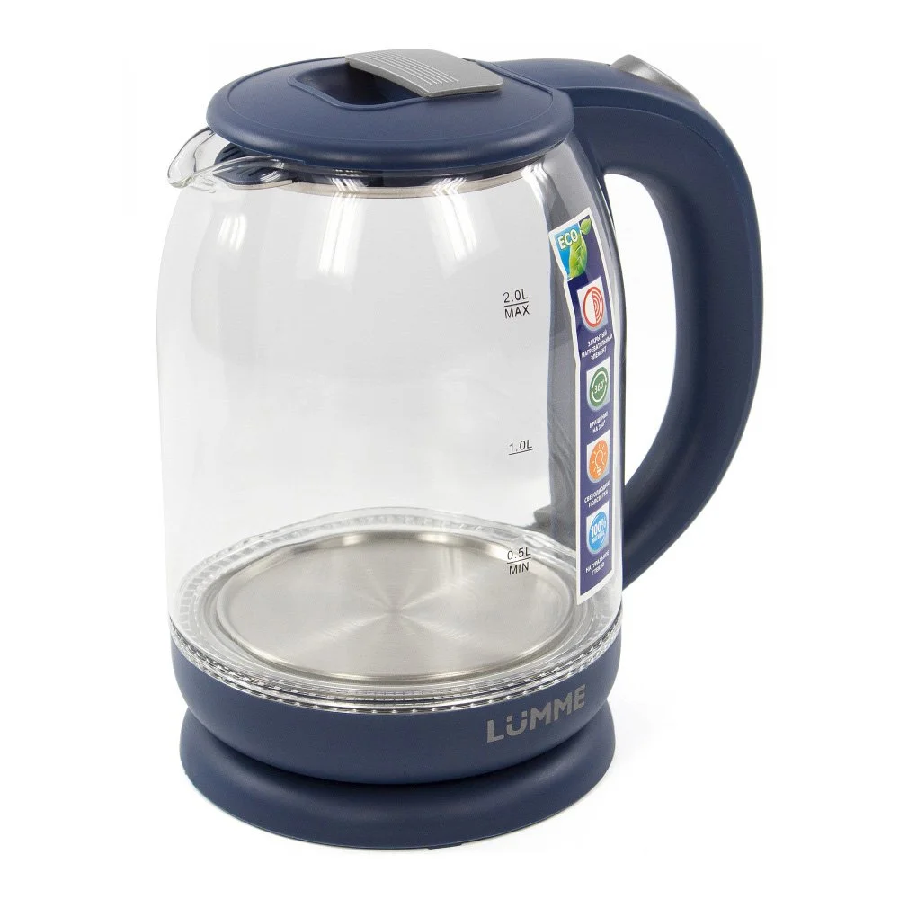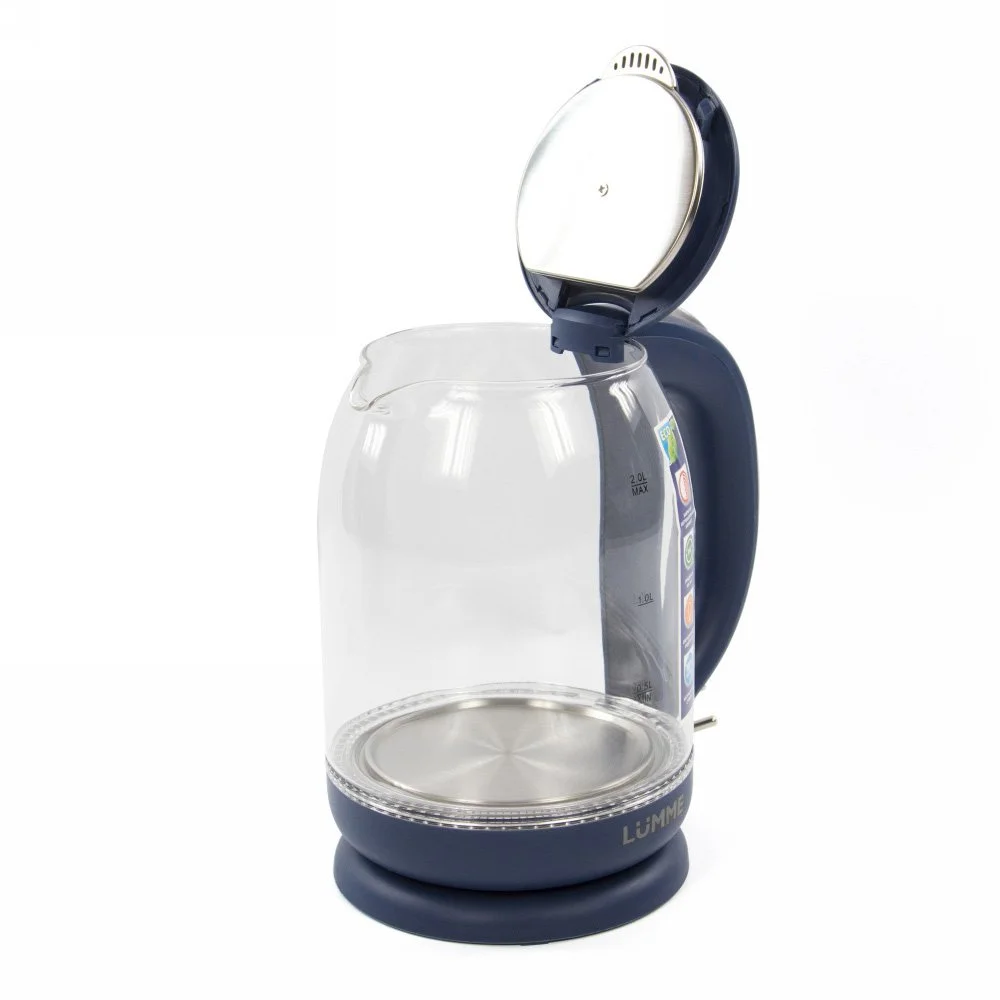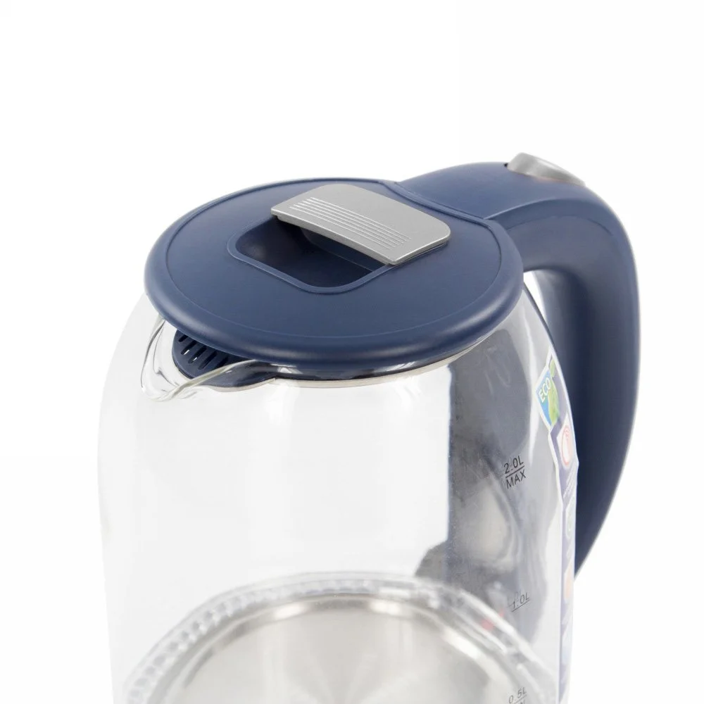 - Легкий ударопрочный стеклянный чайник с голубой внутренней подсветкой в элегантном прозрачном корпусе из закаленного термостойкого стекла объемом 2 литра.