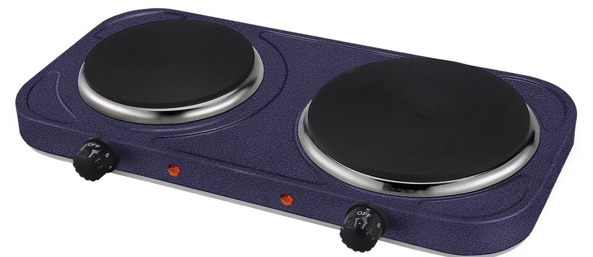 Компактная двухконфорочная электроплитка с нагревательным элементом из чугуна предназначена для быстрого кипячения воды или приготовления горячей пищи в отсутствие стационарной плиты.