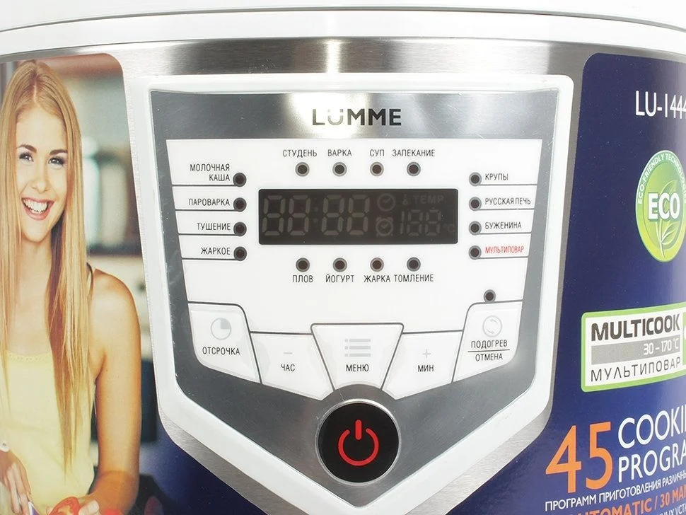 Также, одной из главных особенностей мультиварки LUMME-1444 является возможность ручной настройки времени (от 1 минуты до 14 часов с шагом в 1 минуту) и температуры приготовления (от 30 до 170°C с шагом в 1°C) в настройках любой программы, что позволяет задать 30 вариантов ручных настроек программ приготовления.